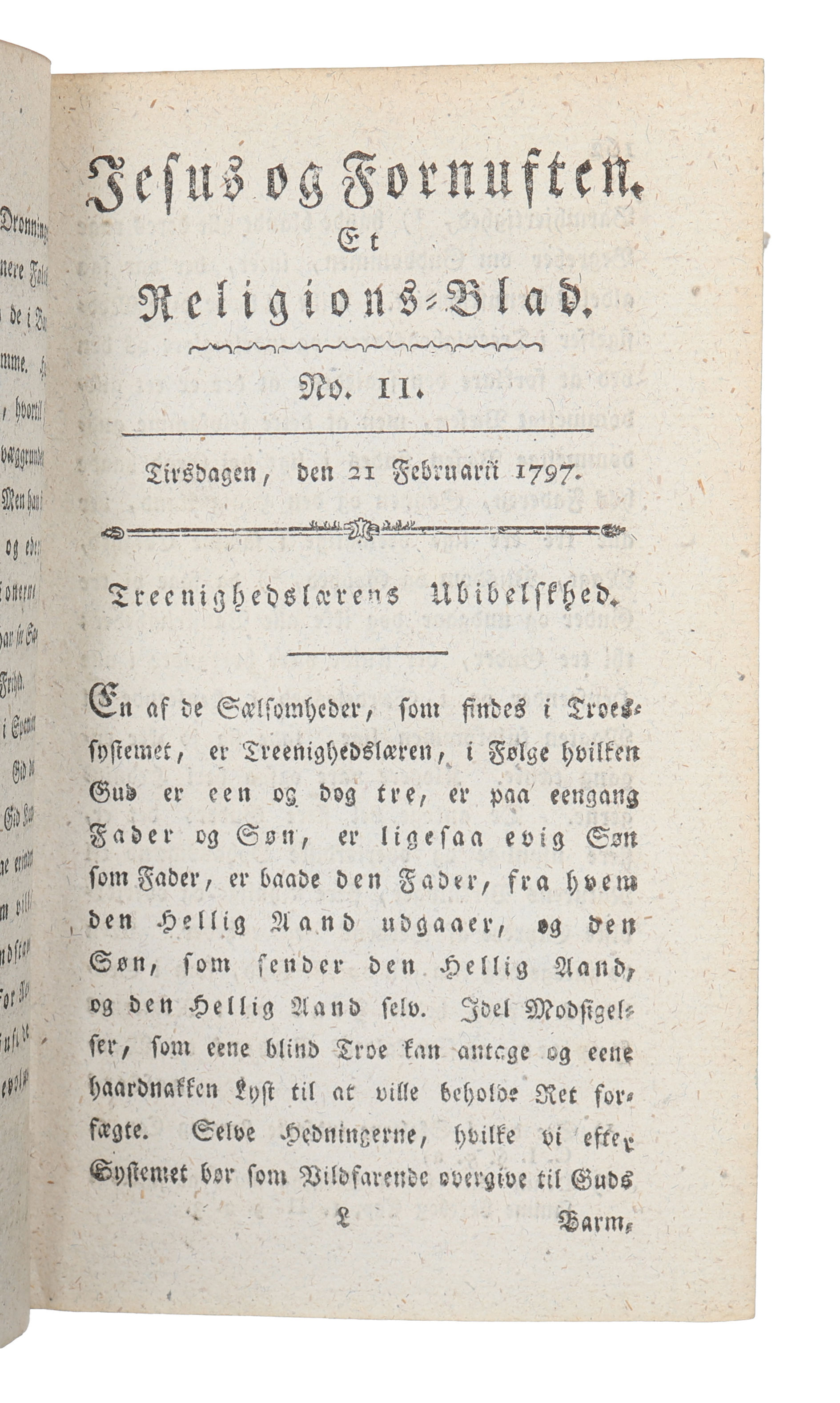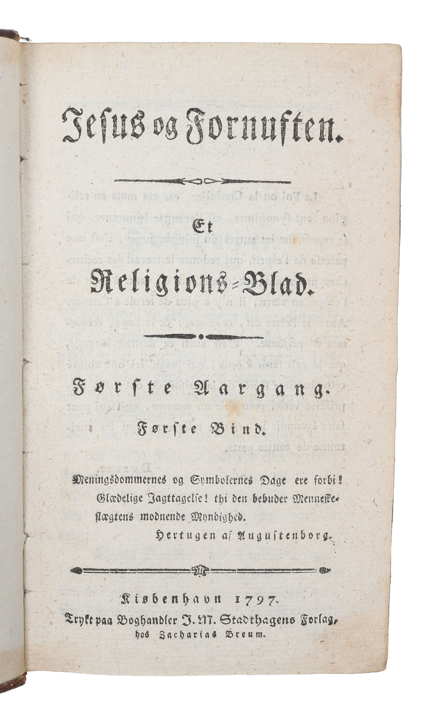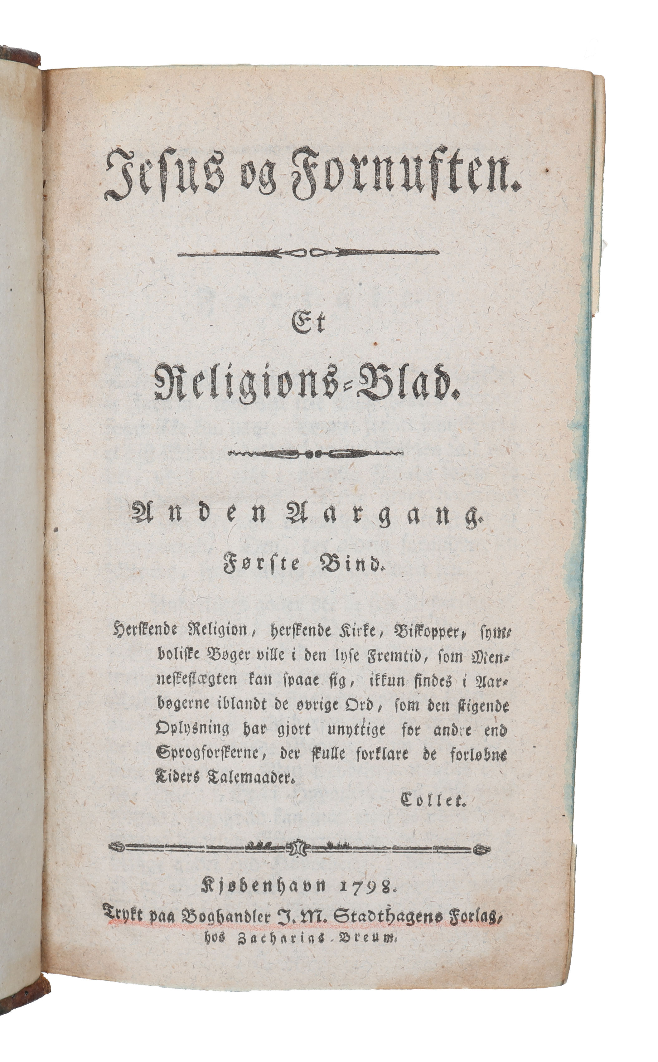 The rare first edition of Horrebow's theological periodical noted for its radical rationalist perspective. Horrebow used the journal as a platform to critique traditional Christian doctrines, engaging in polemics against prominent religious figures including Bishop Nicolai Edinger Balle.