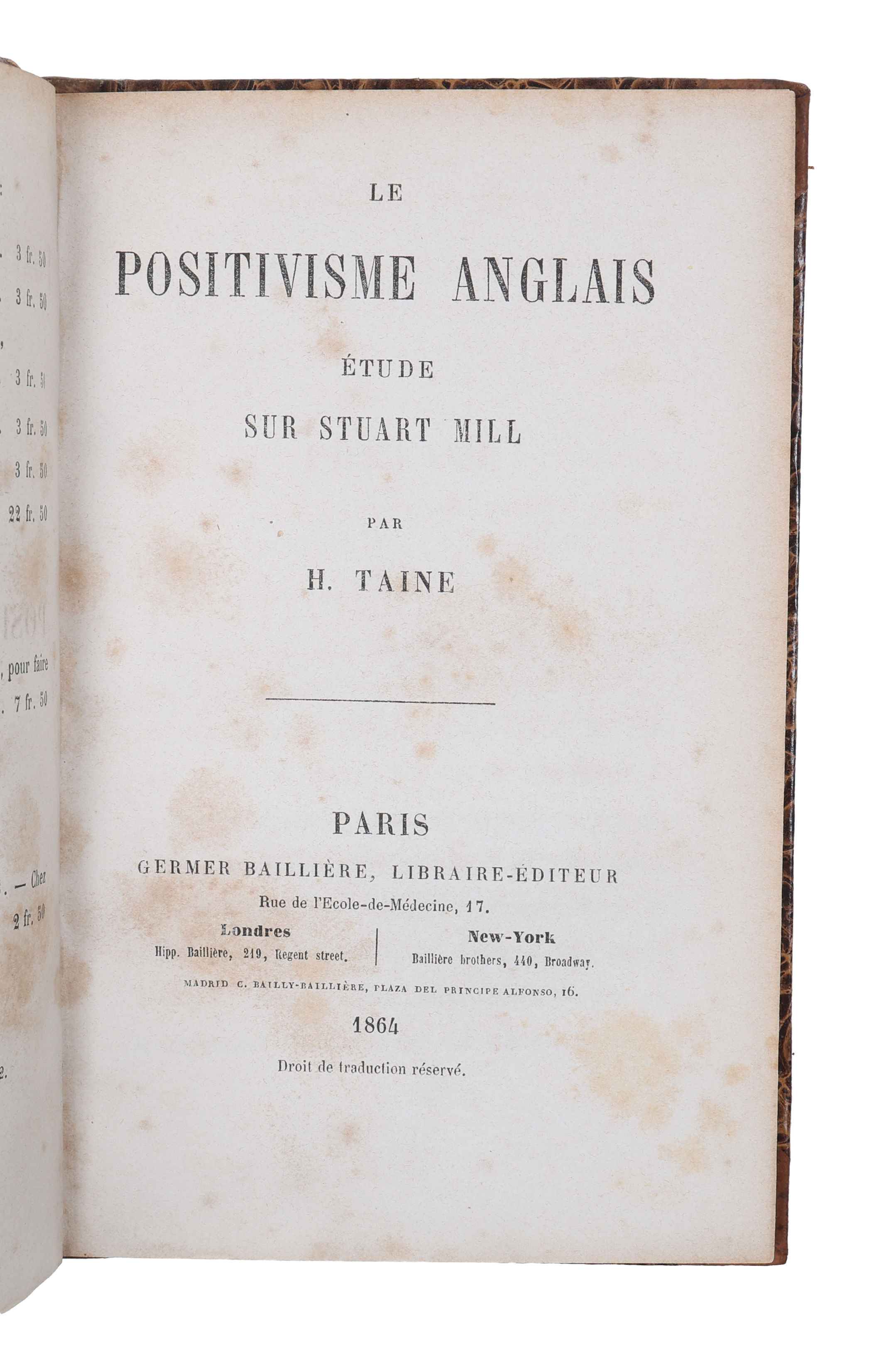The first edition of Taine's study on Mill and English Positivism in general in which he advocates for an alternative, distinctly French philosophy. Taine criticizes Mill for his excessive empiricism, arguing that by limiting himself to experience and its immediate data, Mill has merely described the English mind while believing he was describing the human mind.