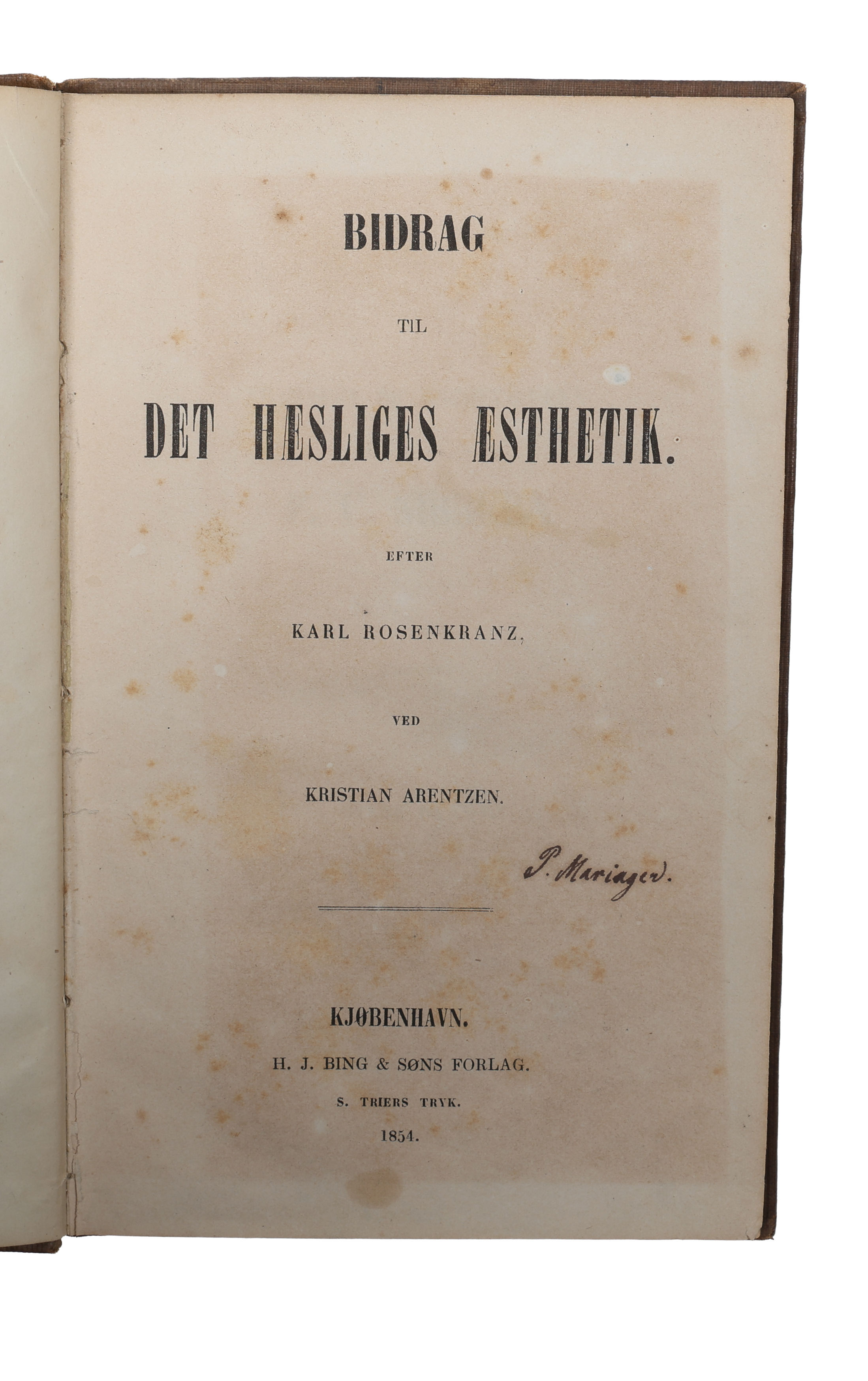 Den ualmindelige originaludgave af den første danske (omarbejdede) udgave af Johann Karl Friedrich Rosenkranz' 'Ästhetik des Hässlichen' (1853). Eksemplaret har tilhørt den danske forfatter Peter Mariager (1827-1894) og bærer hans navnetræk samt flere af hans understregninger i teksten.