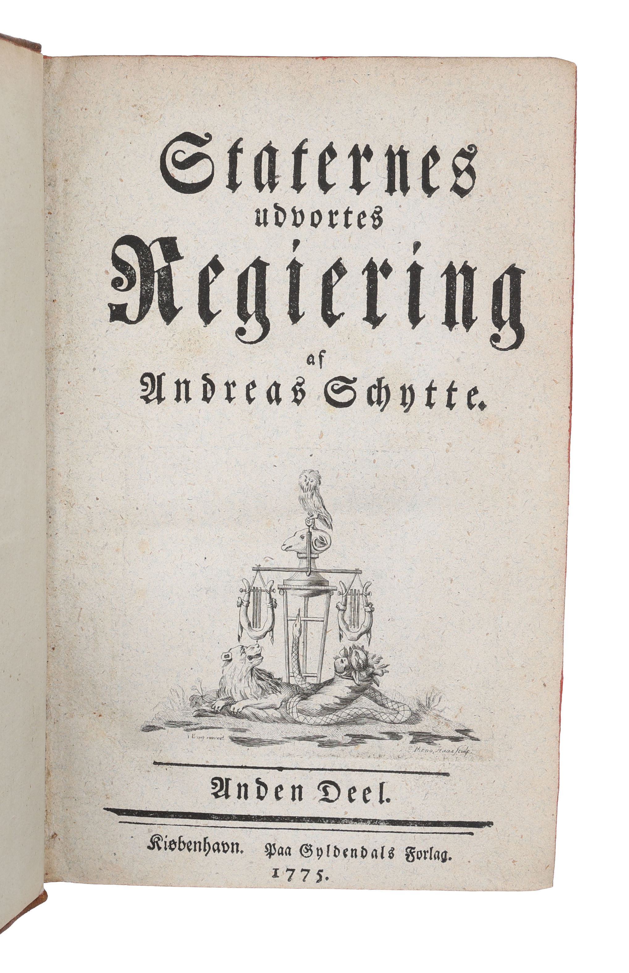 First edition of one of Schytte’s most famous work, the first extensive coherent exposition of constitutional law, political and economic matters relating to Denmark. Schytte was much influenced by Montesquieu. Biblioteca Danica II, 485.