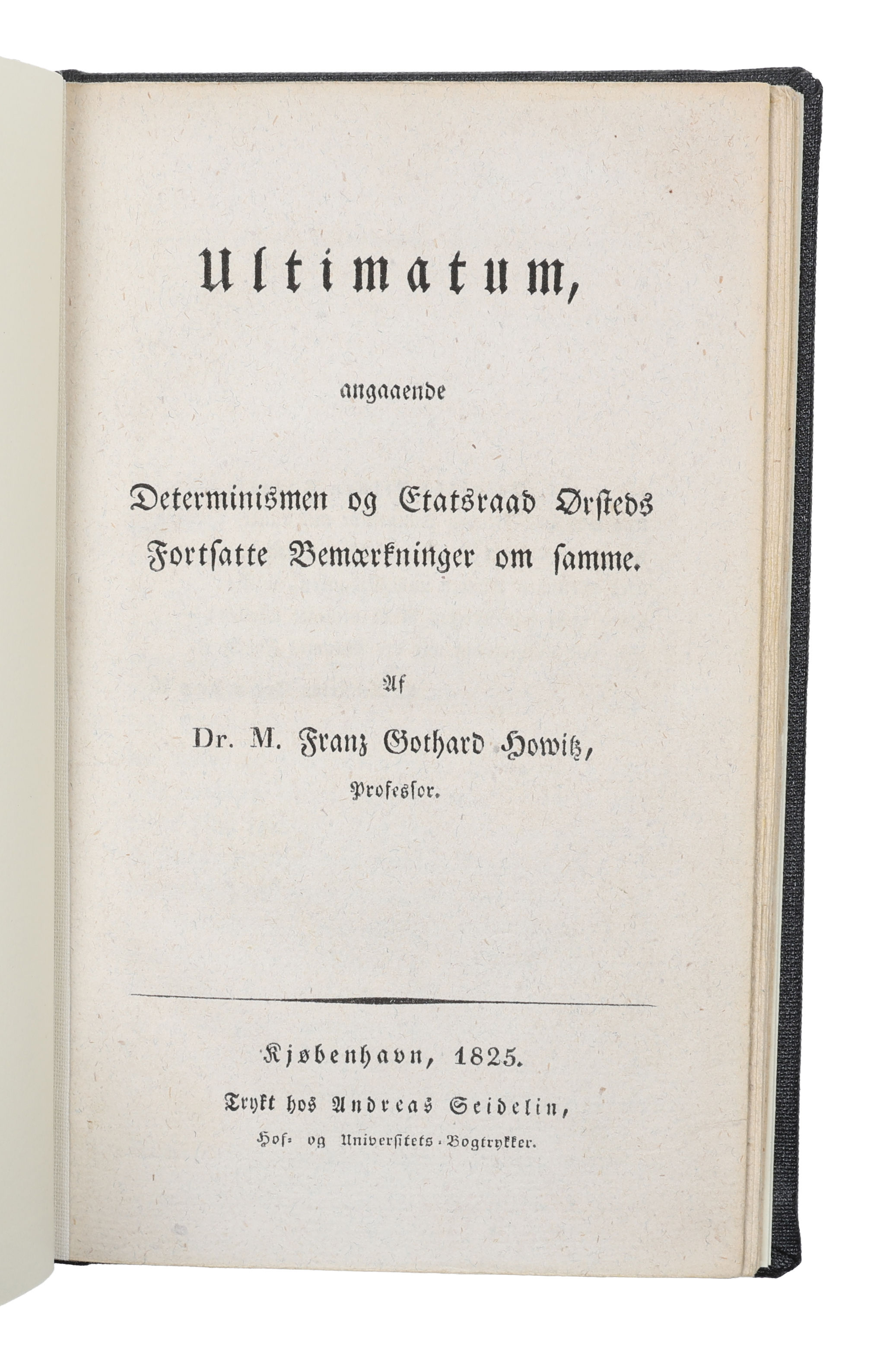 Originaludgaven af Howitz' tredie og sidste indlæg i fejden mod Ørsted om viljens frihed, -den sjældneste af de tre og tillige det klareste og bedste af hans tre indlæg.I dette afsluttende værk løsriver Howitz sig fra materialismen og betragter den som ren erfaringssandhed. Således kommer indeterminismen til at benægte årsagssætningens almene gyldighed, og erfaring som grundlaget for videnskaben ryger. Med den første af afhandlingerne fra 1824, "Om Afsindighed og Tilregnelse, et Bidrag til Psykologien og Retslæren", indledte Howitz det 19. århundredes danske diskussion om viljens frihed. Howitz mente, at samtidens retslærde (med Ørsted i spidsen) ikke forstod forholdet mellem menneskets normale fornuftstilstand og den afsindige tilstand, og han påbegyndte dermed en diskussion af det juridiske begreb om tilregnelighed, bag hvilket han mente at se Kants frihedslære. Hans mål var at få ændret synet på domme i straffesager, hvor ydre omstændigheder burde siges at kunne svække den sagsøgtes evne til at handle fuldt rationelt, - dette foregriber således et fokus på faktorer, der i dag lægges megen vægt på, når der afsiges domme.Med Hume søger Howitz således at gendrive Kants lære om menneskets frihed. Han sætter lighedstegn mellem forholdet motiv-handling og forholdet årsag-virkning, og således kan der, ifølge Howitz, når det gælder menneskelige handlinger, heller ikke findes noget, der er uden årsag. Howitz opfattede dog ikke, helt på linie med Hume, denne naturnødvendighed som værende i modstrid med friheden.Efter Howitz' første skrift svarer Ørsted i 1824 igen med sin "Et Par Ord; i Anledning af den foranstaaende Afhandling". Howitz' andet værk fra 1824, "Determinismen eller Hume imod Kant", er et gensvar på Ørsteds svar, og Howitz fastholder sine meninger fra det første indlæg og sætter trumf på ved bl.a. at påpege, "at den kantske frihed er en videnskabelig uting, idet det må gælde for såvel den moralske som den fysiske natur, at den er underkastet love." (Koch, p. 191)"Med Howitz' 180 sider store antikritik fik striden om viljens frihed en uheldig litterær drejning og kom mere til at handle om den rette tolkning af filosofiske påstande end om den sag, der lå Howitz på hjerte. Han citerede talrige autoriteter og diskuterede indgående, hvorvidt Kants erkendelsesteori og moralfilosofi rummer indre modsigelser eller ej. Da Ørsted kort efter vendte sig imod Howitz' antikritik, fandt han rig anledning til at understrege, at Howitz' filosofiske indsigt var betydelig mindre end hans arrogance over for anderledes tænkende." (Koch, p. 191).