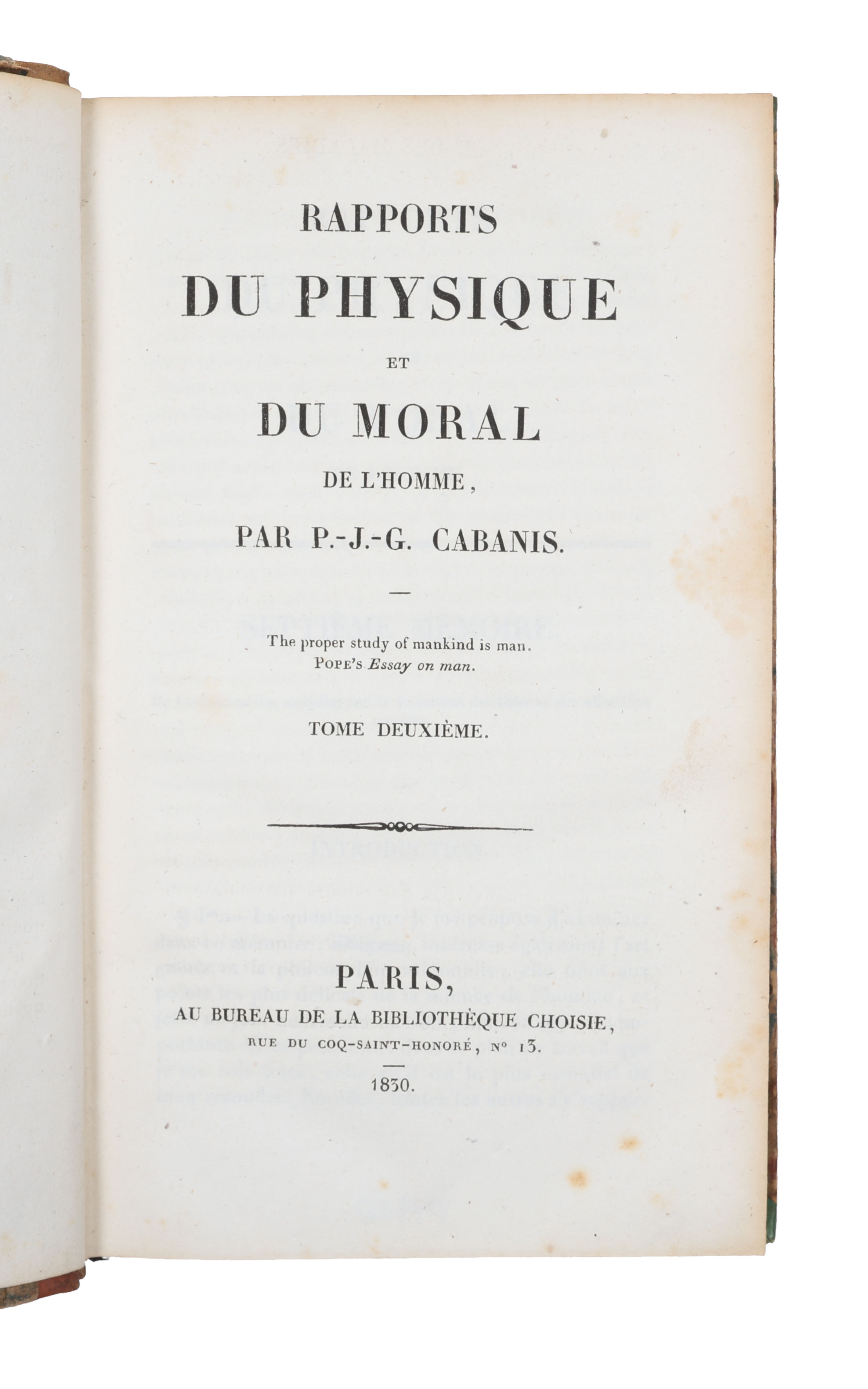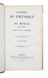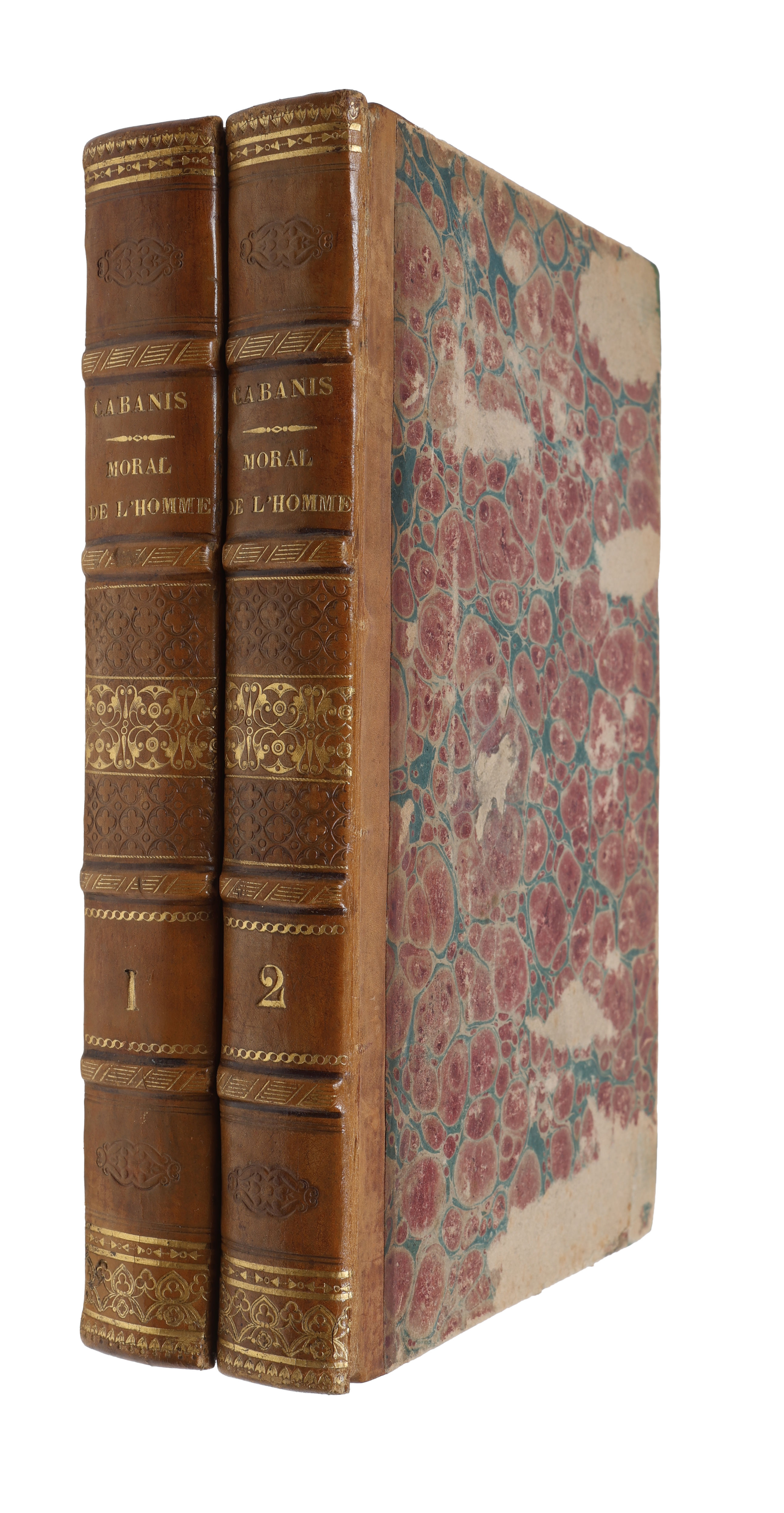 Later edition of this work, which in the 19th century was considered as one of the finest works dedicated to the science of man. “As a philosopher, Cabanis sought in medicine an instrument for the analysis of ideas, that is to say, for the reconstruction of their genesis. His fundamental philosophical work, Rapports du physique et du moral de l’homme, is presented as “simple physiological researches.”1 It is composed of twelve Mémoires (the first six of which were first read in the sessions of the Institute) collected in one volume in 1802. In this work Cabanis sets forth a psychology and an ethical system based on the necessary effects of an animal’s organization upon its relationships with its environment. Even the unlimited perfectibility of the human species, which renders it “capable of all things,” derives from the fact that “man is undoubtedly the most subject to the influence of exterior causes.”(DSB)