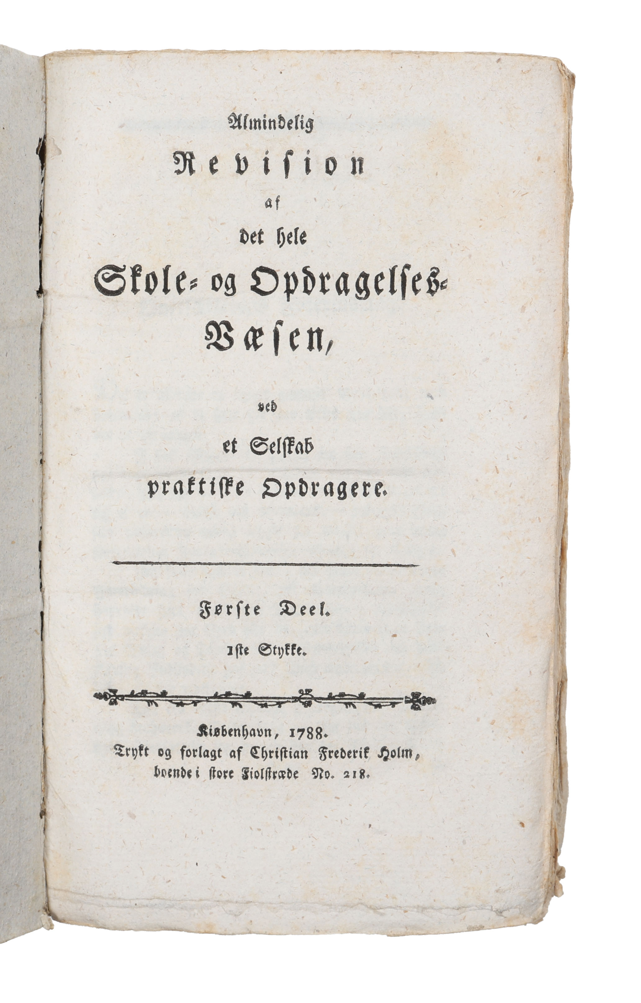 Den yderst sjældne første del af den første danske udgave af Campe's "Allgemeine Revision des gesammten Schul- und Erziehungswesens von einer Gesellschaft praktischer Erzieher", 1785 - Oplysningstidens pædagogiske hovedværk, hvor hovedmændene for den "filantropistiske skole" fremkom med deres hovedværker. - Der udkom yderligere i 1805 et tillæg, indeholdende 15. og 16. afhandling. - Biblioteca Danica I, 1003.