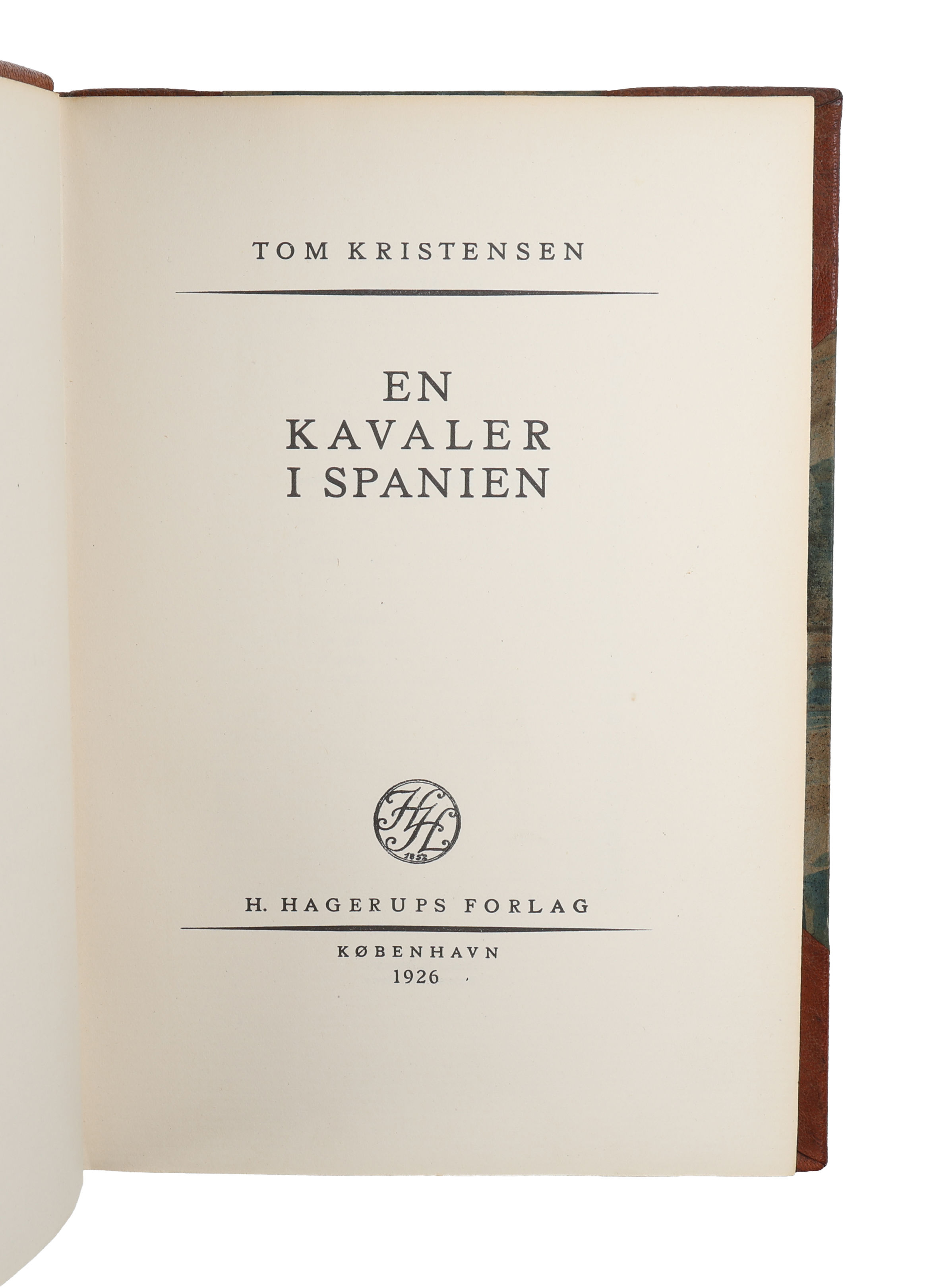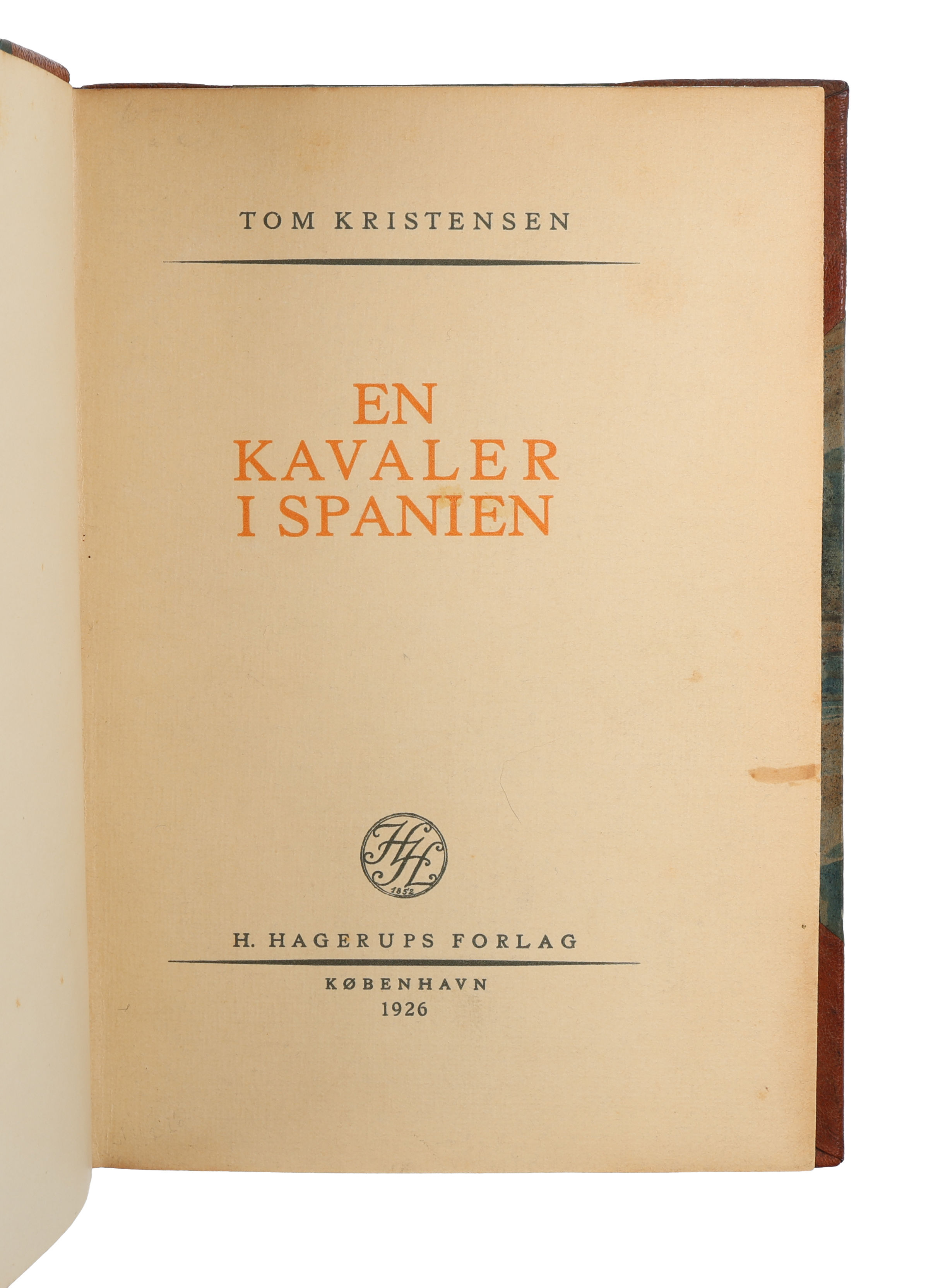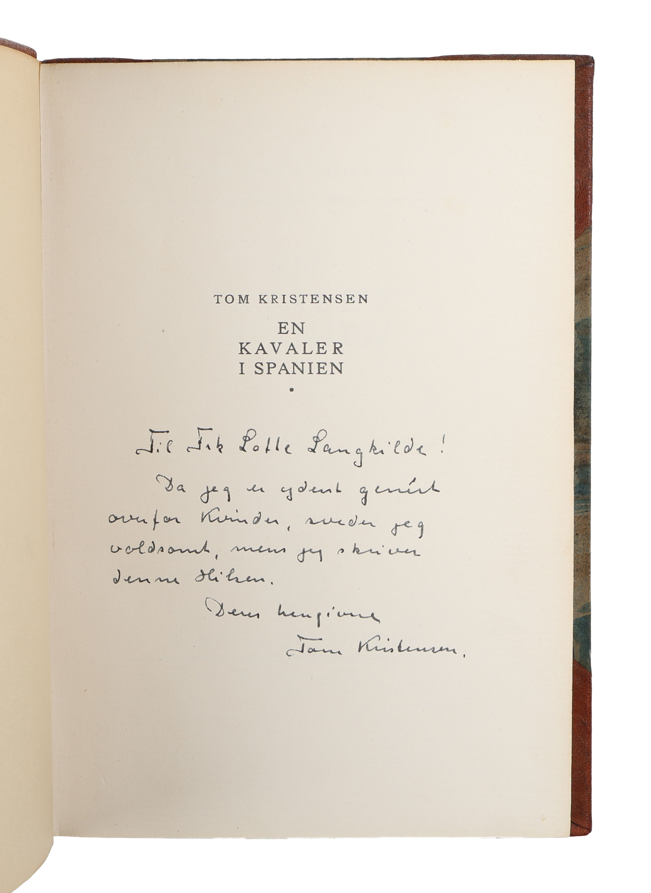 København, H. Hagerups Forlag, 1926. Indbundet med de originale omslag i et samtidigt halvlæderbing (af Peter Egebjerg). Med dedikation fra forfatteren på halvtitel: "Til Frk Lotte Langkilde! / Da jeg er yderst genert / overfor kvinden / sveder jeg / voldsomt, mens jeg skriver / denne hilsen. / Deres hengivne / Tom Kristensen. Ryg misfarvet og med ridser, indvendig pæn og ren.