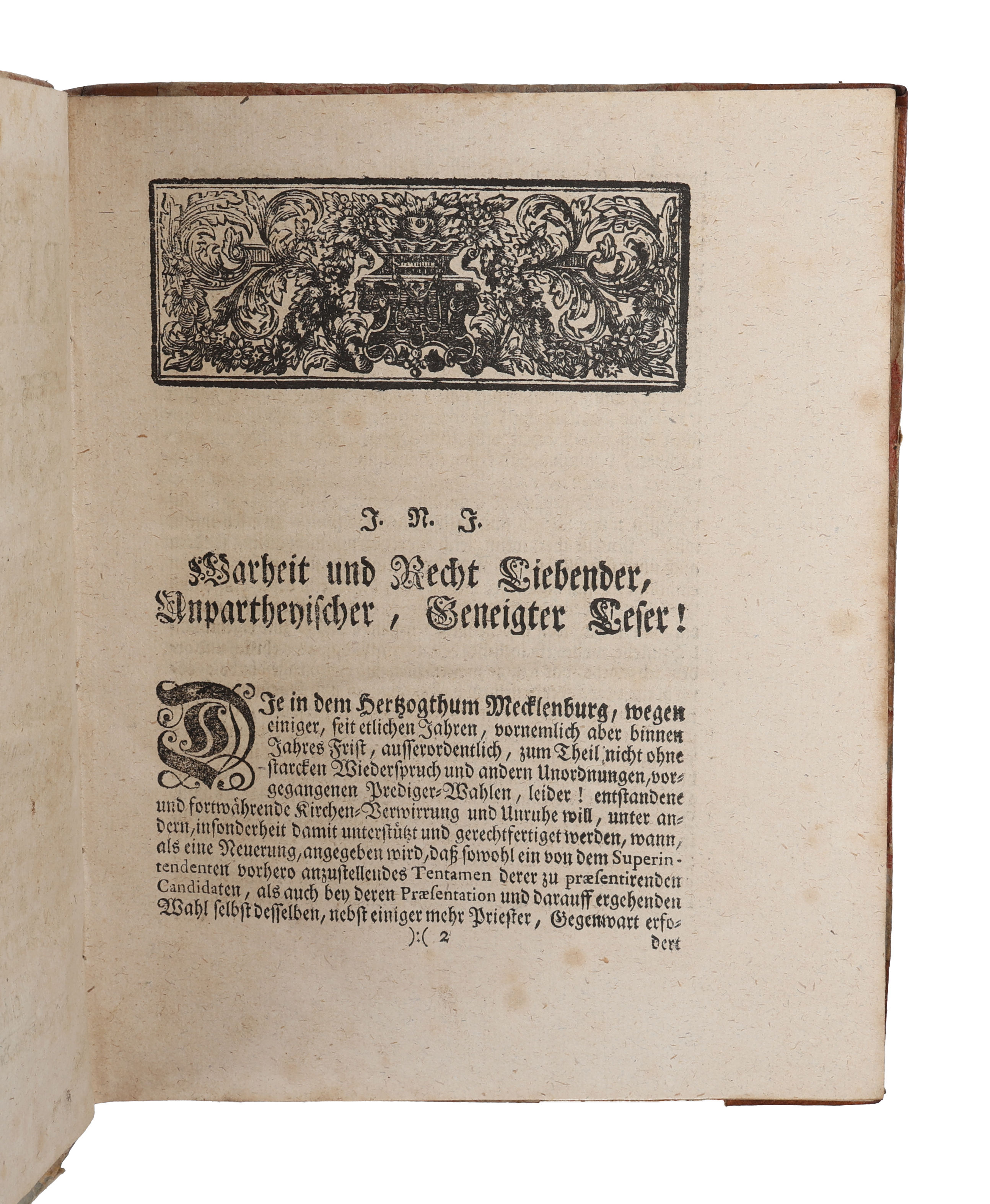 First edition of these two theological and ecclesiastical treatises dealing with church governance and theological controversy in 18th-century Germany—particularly in Mecklenburg.