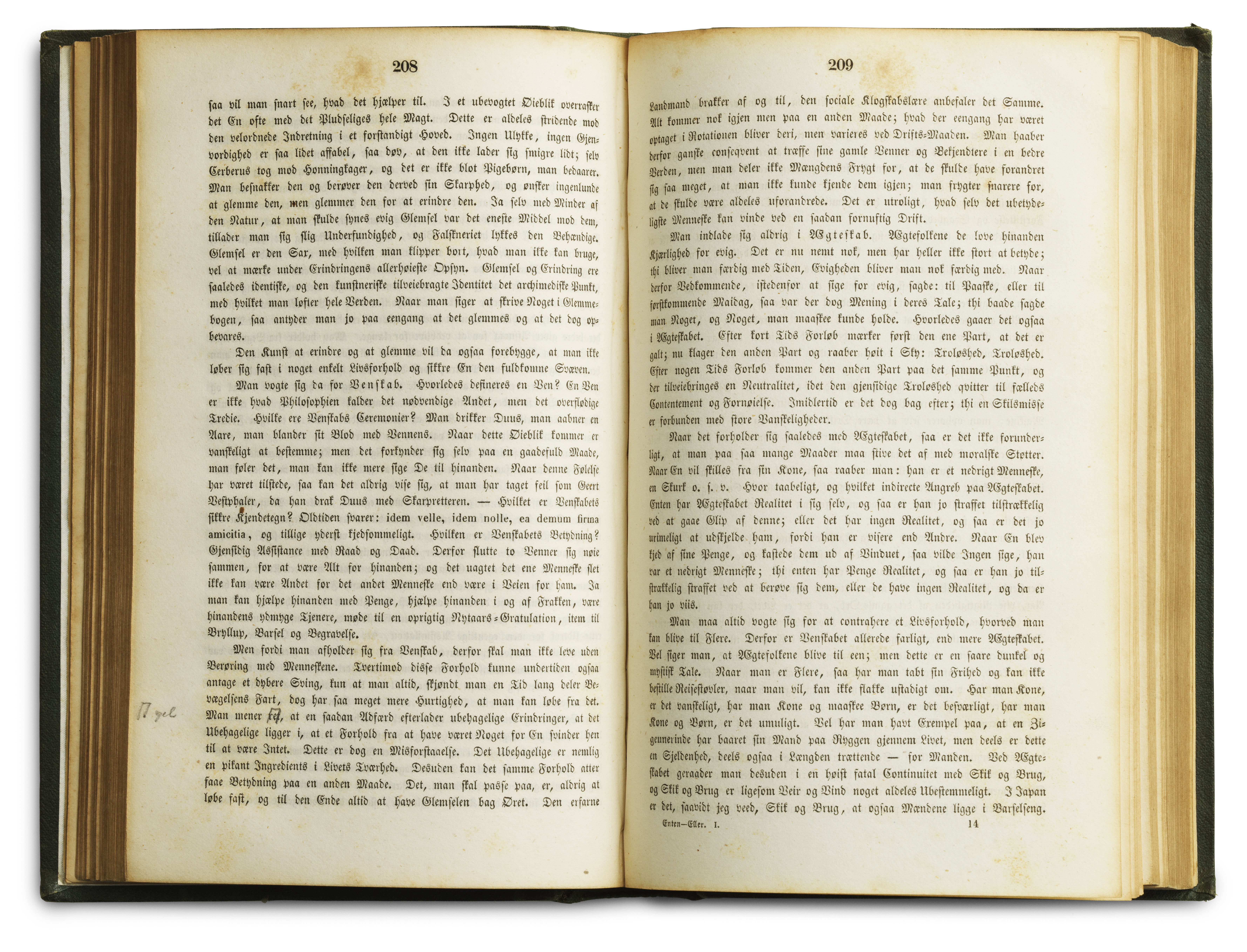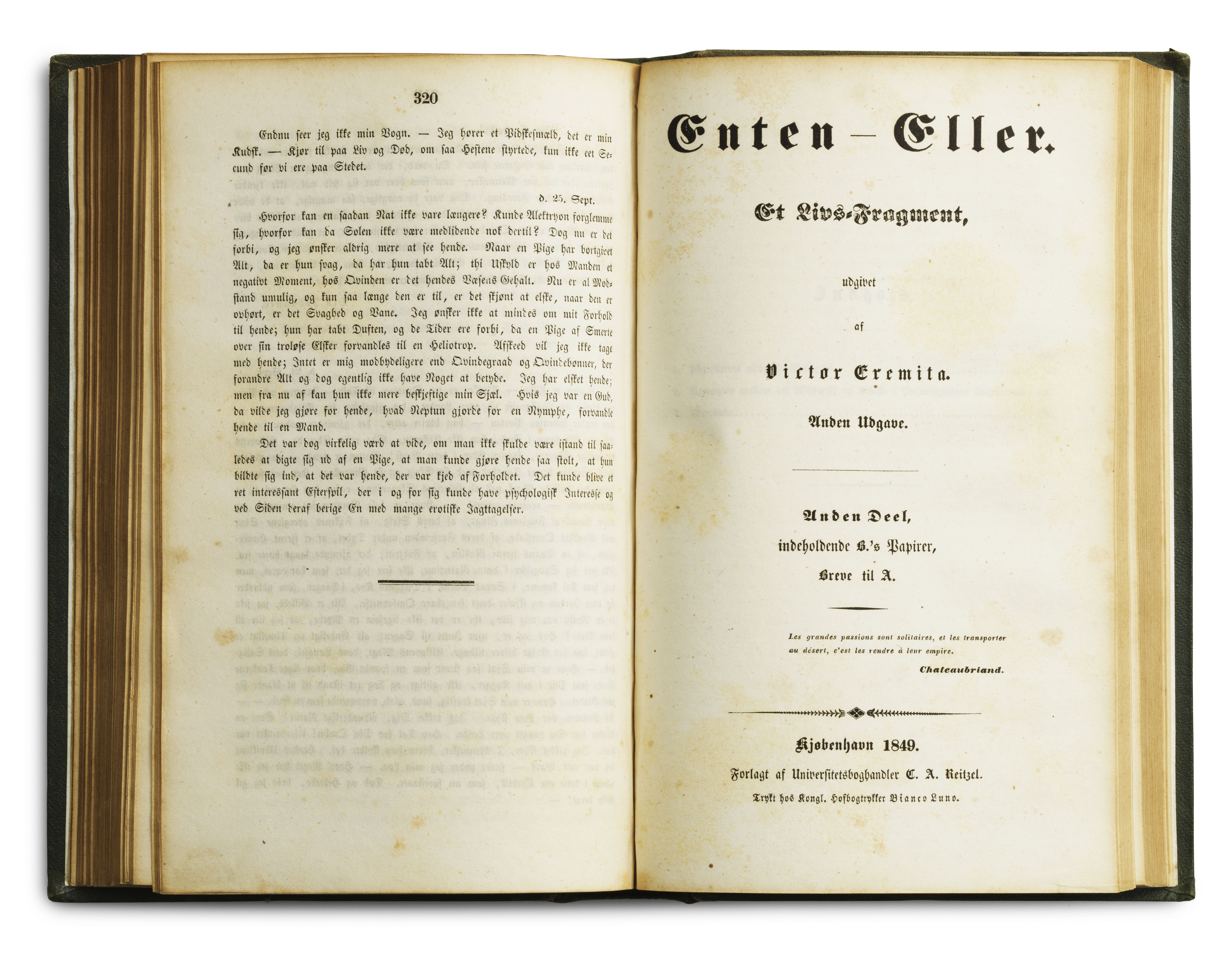 Kierkegaard’s own personal copy of the second issue of Either-Or, with his own corrections – one of them correcting a “not” to an “either”! This copy is with all likelihood nr. 2116 of the auction catalogue of Kierkgaard’s book collection – there merely described as “dainty binding with gilt edges”. The title-gilding on the spine, including the types, the fond, and the size, is identical to that of the five presentation-bindings of the second edition of Either-Or that have been preserved and identified (the ones for Hertz, Andersen, and Winther being the only ones with the presentation-inscription preserved). The spine- and the border-decoration, however, differs, as there is no decorative border on the other copies, which all have gilt volume-identification on them. This is clearly one of the dainty copies Kierkegaard had made, but differing somewhat from the copies he gave away. The style of the handwritten corrections is identical to those in Kierkegaard’s copy of Stadier paa Livets Vei (Stages on Life’s Way) (ex the collection of Muüllertz). The two corrections are:Vol. 1 p. 208: correcting “ret” to “vel”, i.e. meaning to change the sentence “One rightfully feels” to “One presumably feels”Vol. 1 p. 275: correcting “ikke” to “enten”, i.e. meaning to change the sentence “I could not use the conversation…” to “I could either use the conversation…” The two errors were first publicly identified with the publication of Kierkegaard’s collected works half a century later. It is absolutely magnificent to have here what is with all likelihood Kierkegaard’s own personal copy of his magnum opus, with his own handwritten corrections in it. In the light of the history of the work, it makes perfect sense for Kierkegaard to have used and read the second edition of the work. Kierkegaard’s magnum opus Either-Or is considered the foundational work of existentialism and doubtlessly the most famous work by the greatest Scandinavian philosopher of all times, who "is now generally considered to be, however eccentric, one of the most important Christian philosophers" (PMM 314). Kierkegaard's monumental magnum opus seminally influenced later as well as contemporary philosophy and ranks as one of the most important works of philosophy of modern times. Either-Or is the earliest of Kierkegaard’s major works and the work with which he begins his pseudonymous authorship. Kierkegaard’s pseudonymity is an entire subject unto its own. The various cover names he uses play a significant role in his way of communicating and are essential to the understanding of his philosophical and religious messages. And it all properly begins here, with his groundbreaking magnum opus. Conjuring up two distinctive figures with diverging beliefs and modes of life – the aesthetic “A” of Part One, and the ethical B (note that this is the first “pseudonym” that Kierkegaard uses, in his earliest articles – no. I above)/Judge Vilhelm of Part Two, Kierkegaard presents us with the most basic reflections on the search for a meaningful existence, seen from two completely different philosophical views. This masterpiece of duality explores the foundational conflict between the ethical and the aesthetical, providing us along the way with the now so famous contemplations on music (Mozart), drama, boredom, pleasures, virtues, and, probably most famously, seduction (and rejection – The Seducer’s Diary). It is primarily Judge Vilhelm from Part Two of Either-Or that has bestowed upon Kierkegaard the reputation as the Father of Existentialism. His emphasis on taking ownership of oneself and the importance of making choices has made him the (first) personification of Existentialism and the idea that one does not passively develop into the self that he or she should be or ought to become. Kierkegaard went to great lengths to ensure that the public would not know the identity of the author was of Either-Or. He even had the draft of the work done by several hands, so that employees at the printer’s would also be deceived. Despite his efforts, however, it did not take long for the public to guess that Kierkegaard had written this astounding work. But Kierkegaard himself kept up the façade and did not accept authorship until several years later. Nothing Kierkegaard did was left to chance, which his carefully chosen pseudonyms also reflect. This also spills over in his presentation-inscriptions, which follow as strict a pattern as the pseudonyms themselves – he never signed himself the author, if his Christian name was not listed as the author on the title-page. And seeing that he had not accepted authorship of Either-Or and is not mentioned by name anywhere on the title-page (also not as the editor nor publisher as with the other pseudonymous works), he was not able to give away copies of his magnum opus, which is why no presentation-copy of the first edition exists. The appearance of the second edition of this monumental work was, naturally, carefully planned. Either-Or first appeared in 1843, and due to the great demand for the work, which had originally only been printed in ca 525 copies, it had quickly been sold out; but Kierkegaard refused to have it reprinted. In 1849, finally, he decided to let it appear again, in a textually unchanged version. When the second edition appeared (recte second issue), Kierkegaard had meanwhile owned up to the authorship of Either-Or. He had done so in 1846, in his Concluding Unscientific Postscript to The Philosophical Fragments (own translation): “For the sake of manners and etiquette I hereby acknowledge, what can hardly in reality be of interest to anybody to know, that I am, as one says, the author of Either-Or (Victor Eremita), Copenhagen in February 1843...”. Now, finally, Kierkegaard could give away his magnum opus! In his Papers from 1849, Kierkegaard states (own translation): “The poets here at home each received a 