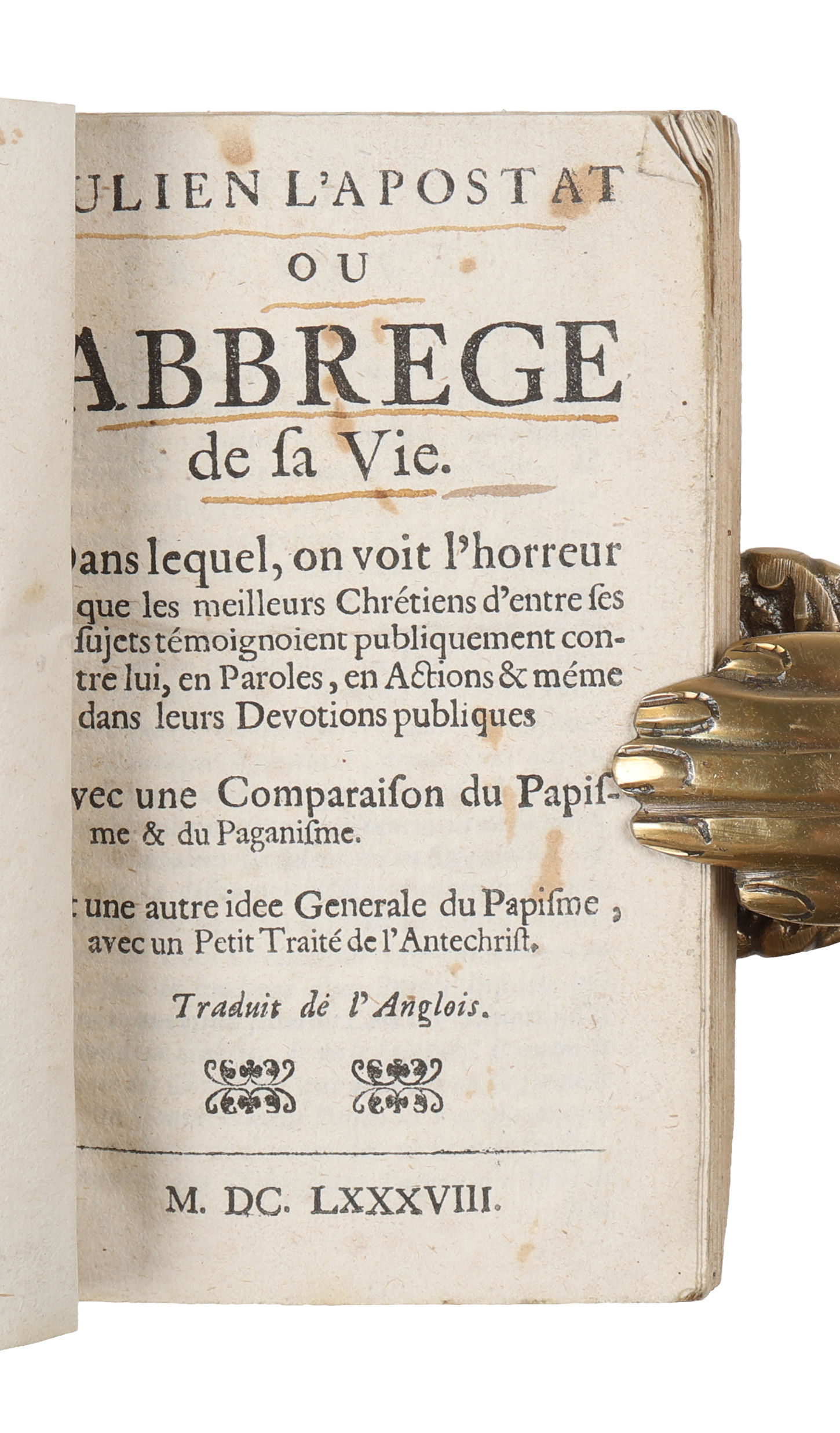 First French translation of Johnson‘s "Julian the Apostate". Samuel Johnson, the rector of Corringham, is famous for the present work which compares Julian the Apostate, a Roman Emperor who attempted to revive paganism, to James, Duke of York, (later King James II) who was a Catholic and a potential successor to the English throne.