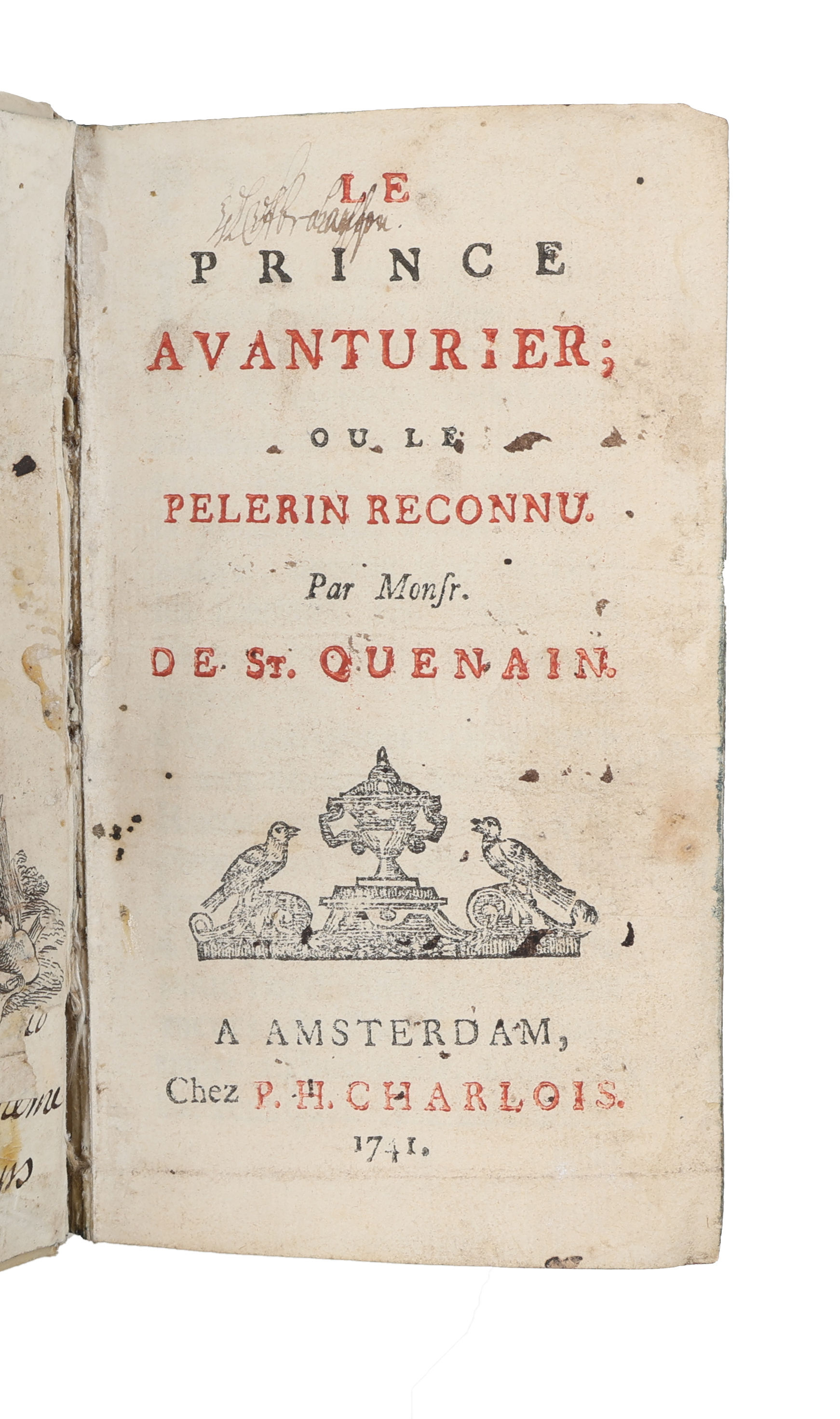 Amsterdam, P.H. Charlois, 1741 (+) A La Haye, Pierre Gosse, 1725. 12mo. In contemporary full vellum with title in contemporary hand to spine. Stains and soiling to extremities. Ex-libris (Juel to Valdemar's Castle) pasted on to pasted down front end-paper. Inner hinges split. Last blank leaf with the following inscription: "Ce livre appartient / à Mademoiselle / Berthe Catherine / Juel 1784 / reçu de Mademoiselle / L. B. Kramer / un souvenir d'elle / quand elle partit écrire / le même soir et en / même temps je". (i.e. "This book belongs / to Miss / Berthe Catherine / Juel, 1784 / received from Miss / L. B. Kramer / a keepsake from her / when she left to write / the same evening and at / the same time I"). Title-page of first work browned and last leaves with a dampstain, otherwise internally nice and clean. (6), 190, 142, (2), 323, (8), (2), 290, (6), 23 pp.