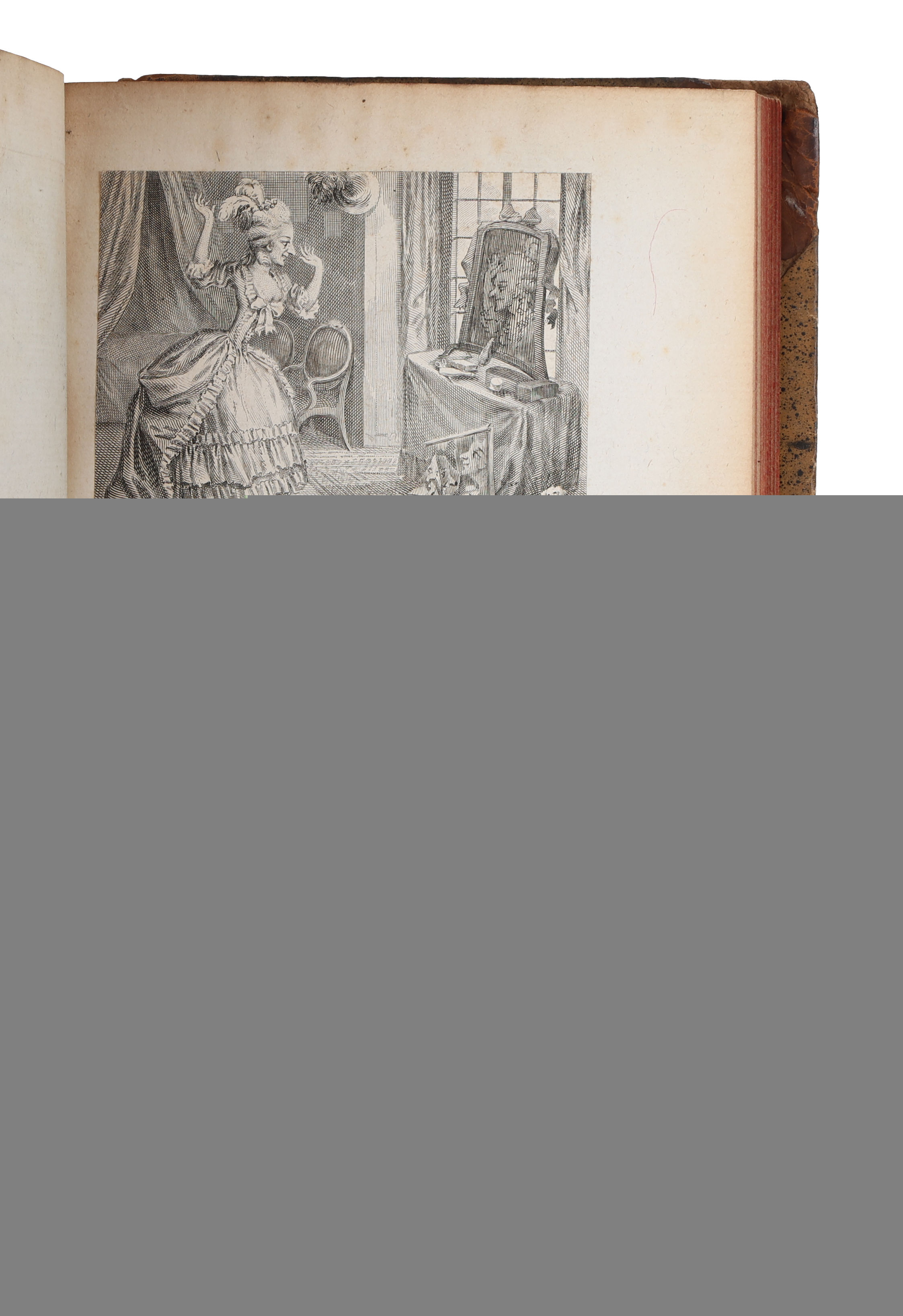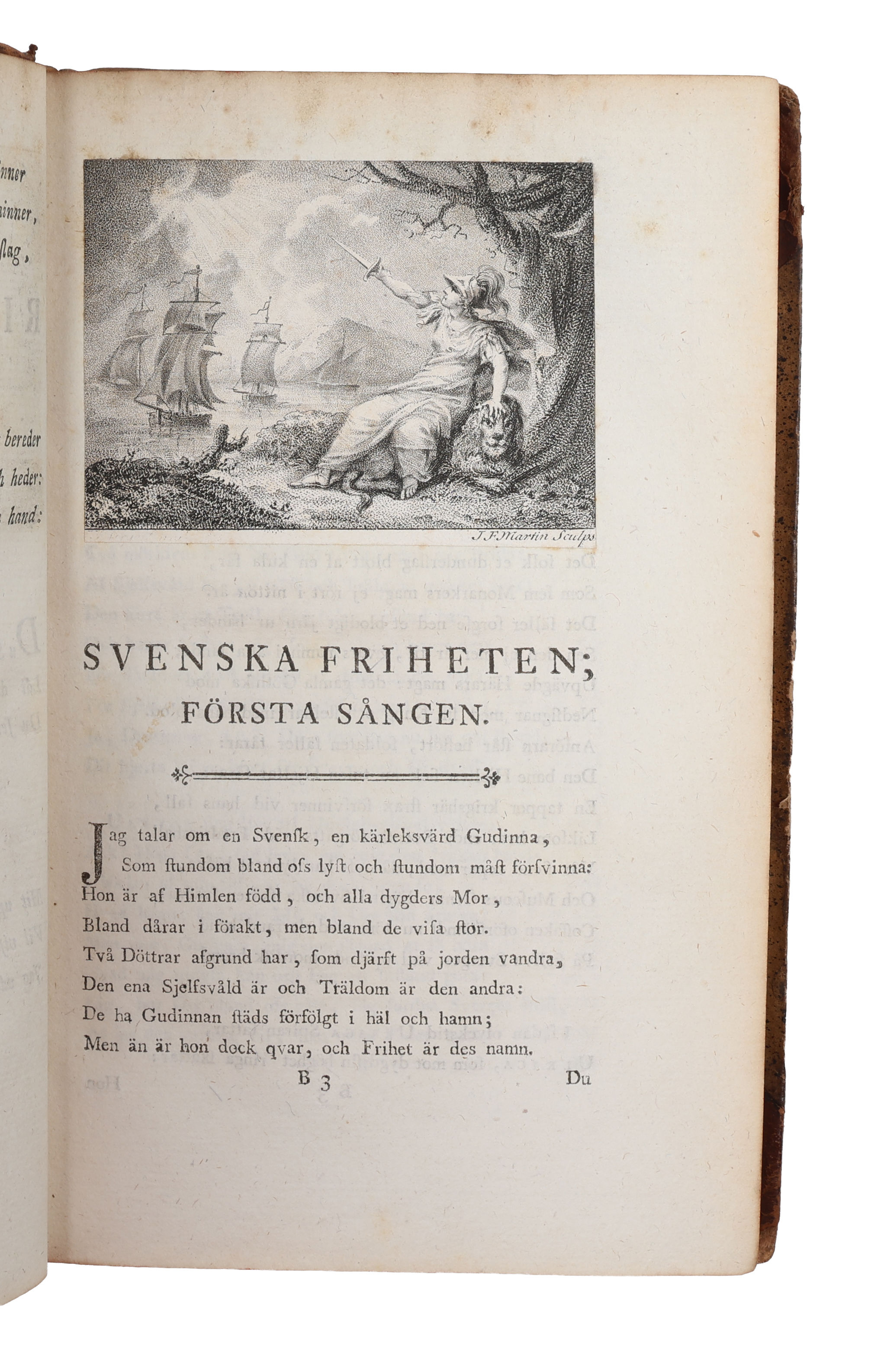 Stockholm, A. J. Nordström, 1782-83. 8vo. Indbundet i to smukke samtidige halvlæderbind med rig rygforgyldning. Forgyldte rygtitler. Fem ophøjede bind på rygge. Rygge med noget slid. Hjørner stødte. Exlibris og tilskrift på indersiden af forperme og forsatsblade. Med forfatterens frontispieceportræt. To helsideskobberstik og tre kobberstukne vignetter i teksten. (2), XVI, 362; (2), 360, (2) pp.