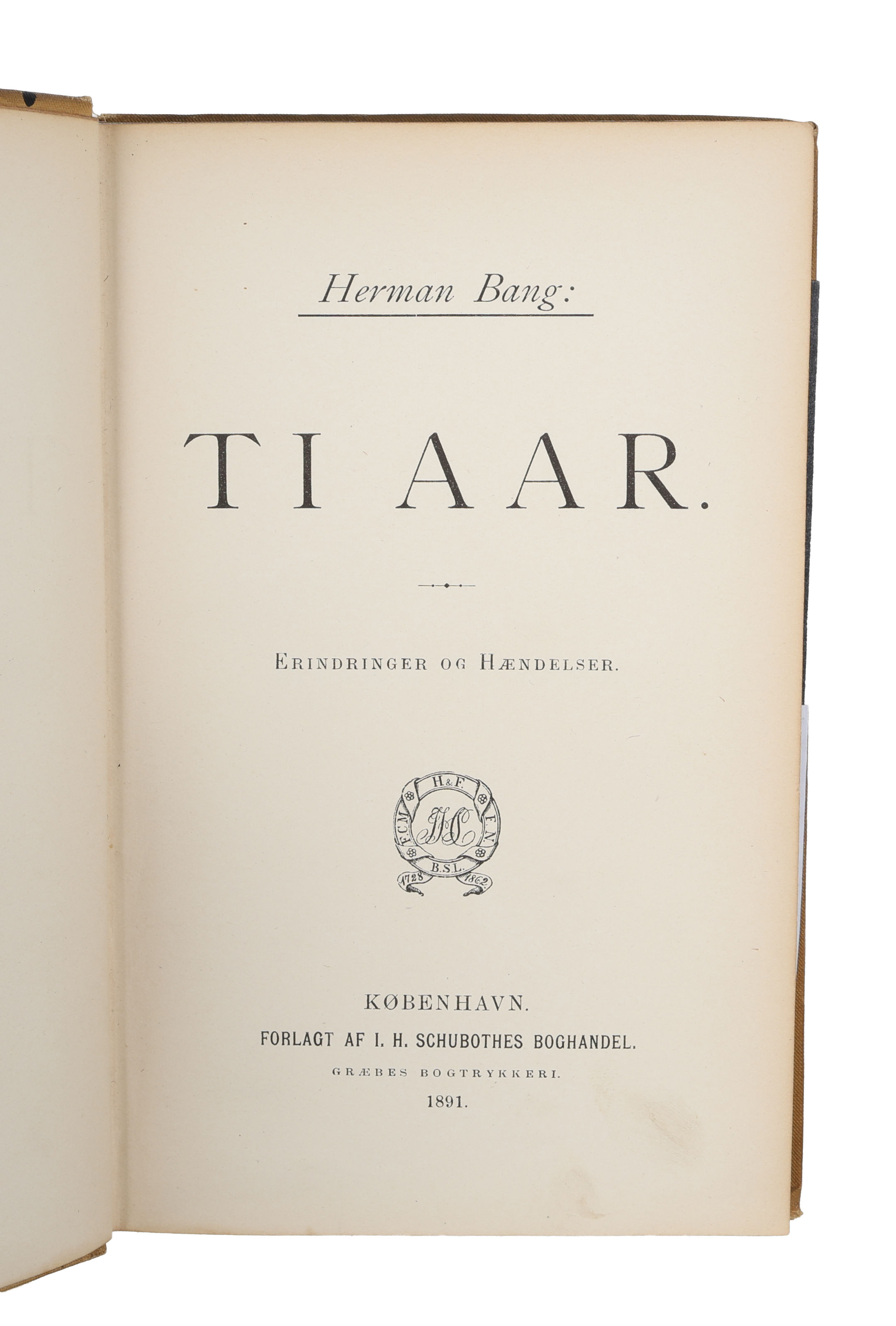 København, I. H. Schubothe, 1891. 8vo. I det originale komponerede helshirtbind med forgyldt rygtitel på ryg og perm. Kapitæler og kanter med en smule slid. Ryg og permer med blækklatter. Hjørner stødte. Exlibris på indersiden af forperm. Med Helmer Linds exlibris på indersiden af forperm. Med dedikation fra Herman Bang på fribladet: "Kære Ven. / Gem genne Bog / som en Erindring om / et Kapitel i mit / en Smule bevægede / Liv. Deres Ven / H. B. / 29.8.96." Ren og pæn indvendig.