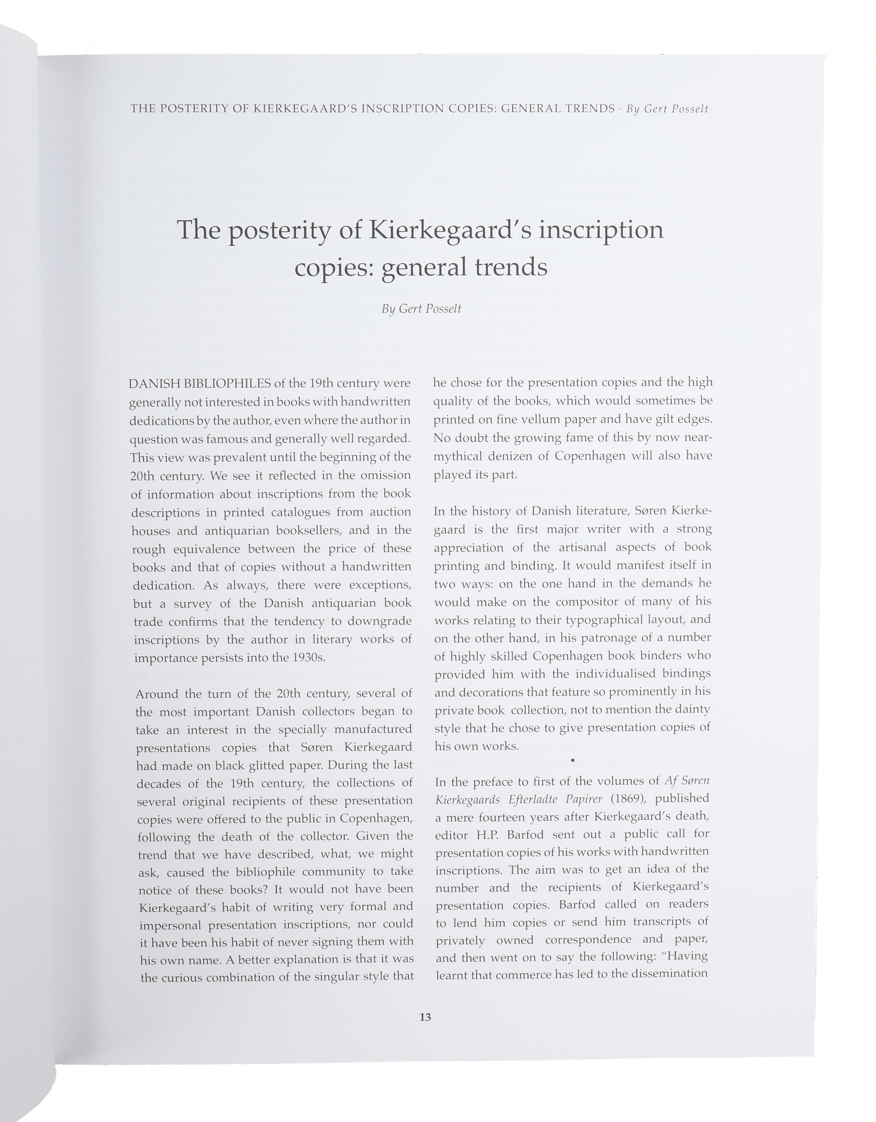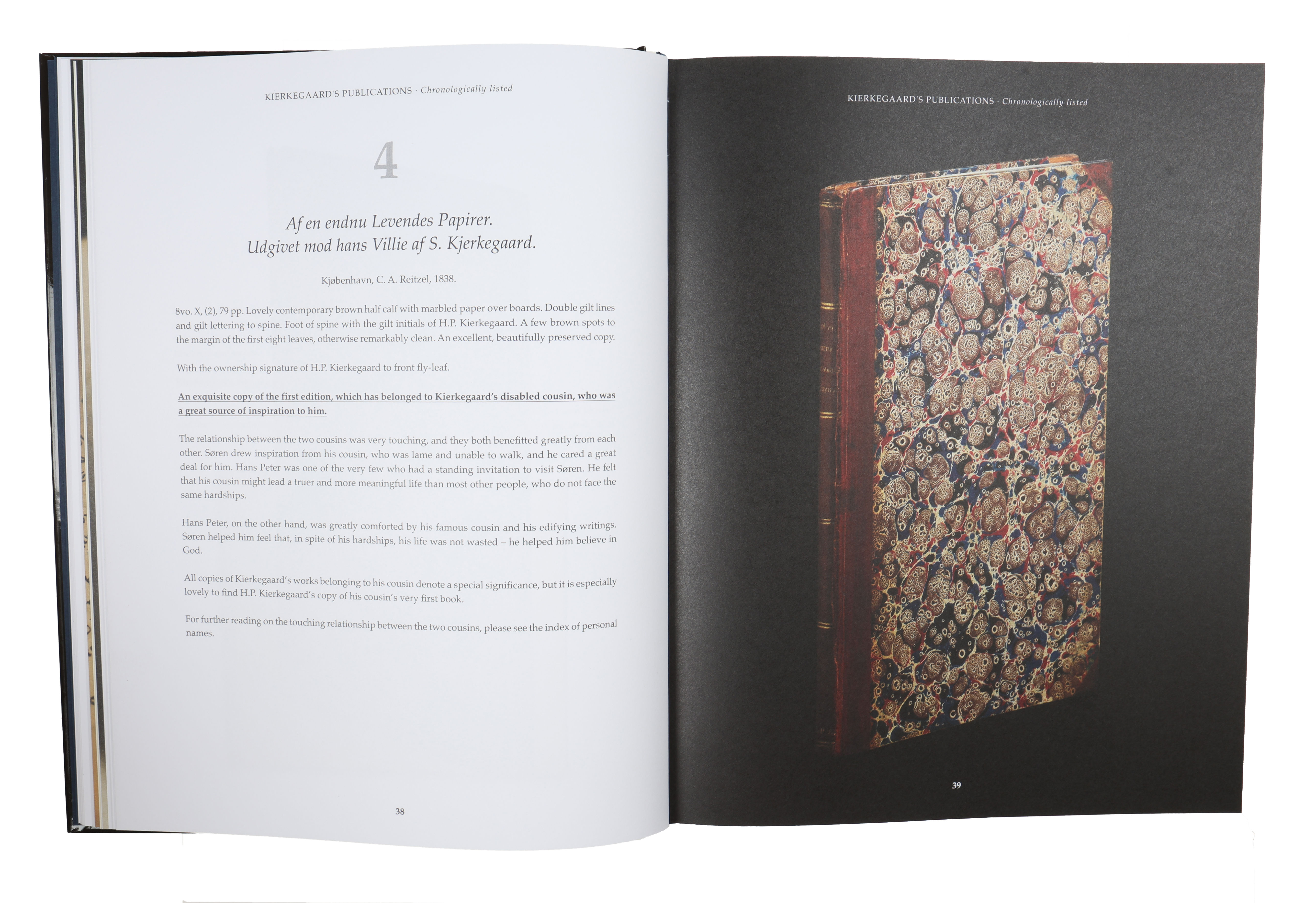 The catalogue contains descriptions of 116 books, being Kierkegaard first editions, presentation-copies, books annotated by Kierkegaard, an original handwritten letter by Kierkegaard, books from Kierkegaard's library, and two books pertaining to Regine Olsen. SØREN AABYE KIERKEGAARD is one of the most important philosophers of all time. He is the father of existentialism, one of the main influences upon postmodernism and existential psychology, is responsible for many of the key concepts in philosophy today, and he just happens to be Danish. As a centuries old antiquarian book shop based in Kierkegaard’s hometown Copenhagen, and specialized in Philosophy, it is not a coincidence that Kierkegaard has always been one of our main specialties. We have arguably the strongest tradition in the world in dealing with first editions, presentation copies, association copies, and books that have belonged to Kierkegaard. And this not only in recent times. In his lifetime, Kierkegaard was a customer of Herman H.J. Lynge & Son, and it was our predecessor, the distinguished Herman H.J. Lynge, who made the auction catalogue of his book collection, when he died. Since the mid- 19th century, Herman H.J. Lynge and Søn has had a special relation to Kierkegaard’s books and has always dealt extensively in these. This is the first time, however, that we have made a large catalogue presentation of the very best items available, not only in Denmark, not only now, but in the whole world, and arguably ever. We dare say that there has never been as many Kierkegaard rarities for sale at once. We have been collecting these choice copies throughout some years, during which we have been lucky to acquire some excellent collections and individual copies, making this unique presentation possible. And we have chosen to sell the books individually instead of as a collection. In the present catalogue, we are thus paying tribute to the greatest thinker of our nation by presenting you with an array of the most interesting copies of books connected to Kierkegaard that one will possibly ever come by. Here presented is not only all of his works in first editions, but also in some of the finest and most interesting copies that one can come by; we have arguably the largest collection of Kierkegaard presentation-copies ever presented at once, several of his own copies of his own books, and possibly the largest collection of books that have belonged to Kierkegaard himself, both books that he has “merely” owned, and books that are inscribed to him. We also have a letter written by Kierkegaard, which is of the utmost scarcity. And finally, we have two books related to Kierkegaard’s fiancé, his muse Regine Olsen.
