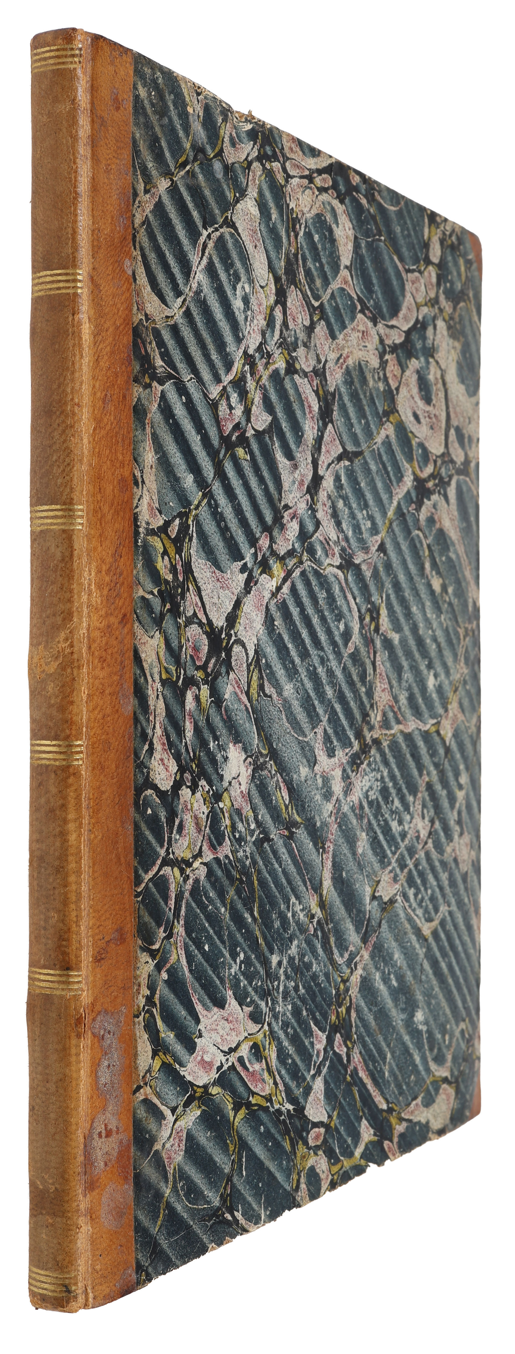 Kjøbenhavn, C. A. Reitzel, 1838. 8vo. X, (2), 79 pp. Lovely contemporary brown half calf with marbled paper over boards. Double gilt lines and gilt lettering to spine. Foot of spine with the gilt initials of H.P. Kierkegaard. A few brown spots to the margin of the first eight leaves, otherwise remarkably clean. An excellent, beautifully preserved copy. With the ownership signature of H.P. Kierkegaard to front fly-leaf. An exquisite copy of the first edition of Kierkegaard's first work, which has belonged to Kierkegaard's disabled cousin, who was a great source of inspiration to Kierkegaard. The relationship between the two cousins was very touching, and they both benefitted greatly from the other. Søren drew inspiration from his cousin, who was lame and unable to walk, and he cared a great deal for him. Hans Peter was one of the very few who had a standing invitation to visit Søren. He felt that his cousin might lead a truer and more meaningful life than most other people, who do not face the same hardships. Hans Peter, on the other hand, was greatly comforted by his famous cousin and his edifying writings. Søren helped him feel that, in spite of his hardships, his life was not wasted – he helped him believe in God. All copies of Kierkegaard's works belonging to his cousin denote a special significance, but it is especially lovely to find H.P. Kierkegaard's copy of his cousin's very first book. Kierkegaard's famous first work sews the seeds of his future career and initiates his philosophical production. It is in this famous review of Hans Christian Andersen as an author of novels, with a particular focus on his Only a Fiddler that Kierkegaard – the then 25 year-old theology student known only in a small academic circle, for his wit and sharp intelligence – puts forth his devastating criticism of Hans Christian Andersen – then 33 years old and already widely famous, Denmark's other national hero and world-famous fairy tale-author. Even though the book is written as a polemic review, we already here witness Kierkegaard's introduction of his emphasis on authentic individual existence will continue throughout his entire production; as thus, From the Papers of one Still Living serves as a highly important introduction to Kierkegaard's philosophical-ethical production. Kierkegaard points out that Hans Christian Andersen has not yet found himself and therefore cannot be a good author. This emphasis on authenticity and on the necessary first stage of the epic becomes an introduction to Kierkegaard's famous theory of stages that he develops in his later works. He rejects the notion that environment is decisive in determining the fate of genius – the genius is a shaping subject, not a passive one formed by circumstances. Not one that needs to be nurtured and sheltered in order not to perish. The work was originally meant to be published as an article in the literary periodical Perseus, of which Johan Ludvig Heiberg was the editor. But the article grew too extensive, and the intended columns in the periodical were given to H.L. Martensen instead. Martensen's article took up 70 pages and was about the idea of Faust, which vexed Kierkegaard, who had wanted to write about that subject himself. Kierkegaard, Hans Peter (1815-62) is always referred to as Kierkegaard's cousin, also by Kierkegaard himself, but if one is to be precise, he was Søren's half-cousin. H.P. was the son of M.P. Kierkegaard's (Søren's father) cousin, M.A. Kierkegaard. H.P. was one of the few people Kierkegaard was personally very close to. As Søren writes in a letter to H.P. (SKS letter no. 27) "you are one of the exceptions". He cared a great deal for his cousin, who was disabled. He was lame, completely paralyzed on one side of the body, and unable to walk. Intellectually, however, he was gifted, and the two cousins grew very close. Søren saw in him a purity that he did not see in other people, an ability to lead a truer and more meaningful life than others, who did not have to suffer in the same way. Søren was also a great comfort to H.P, who read the works of his famous cousin with enthusiasm. He probably owned every single work Kierkegaard wrote, and he drew great comfort from several of them. As Brøchner recalls in his recollections about Kierkegaard (Erindringer om Søren Kierkegaard – no. 43), H.P. "read his cousin's writings with the greatest of interest, occasionally visited him in his home, and drew much spiritual awakening from these visits." Brøchner continues to recall how he once told Kierkegaard what a great impression one of his works, Opbyggelige Taler i forskjellig Aand, had made upon H.P. In the confessional discourse, Søren portrays a person, who due to his bodily disposition is unable to practice anything physically or outwardly, and goes on to beautifully describe how this person too is subject to the same ethical demands as everyone else and what particular form this life-assignment takes on for him. To this, Søren replied "yes! To him, that work is a blessing". And so it was. Reading his cousin's upbuilding works provided the disabled Hans Peter with the power to overpower gloomy thoughts about his life having no meaning. Søren gave him, not only through his writings, but also through his meetings and conversations with him, the feeling of being as important as everyone else, as those who were physically blessed. There is no doubt that Kierkegaard drew inspiration from his admirable cousin, who had to overcome so much. And there is no doubt that H.P. was close to Søren's heart. Apart from Boeson, H.P. was the only person who had a standing invitation. He writes how he admires H.P., who, reconciled with his fate, with patience and devotion solves a task that is just as great as the one everyone else has to solve, whether they do big business, build houses, write great books, etc. – "when all is heard, everything, after all, mainly comes down to fervor – and when all is forgott