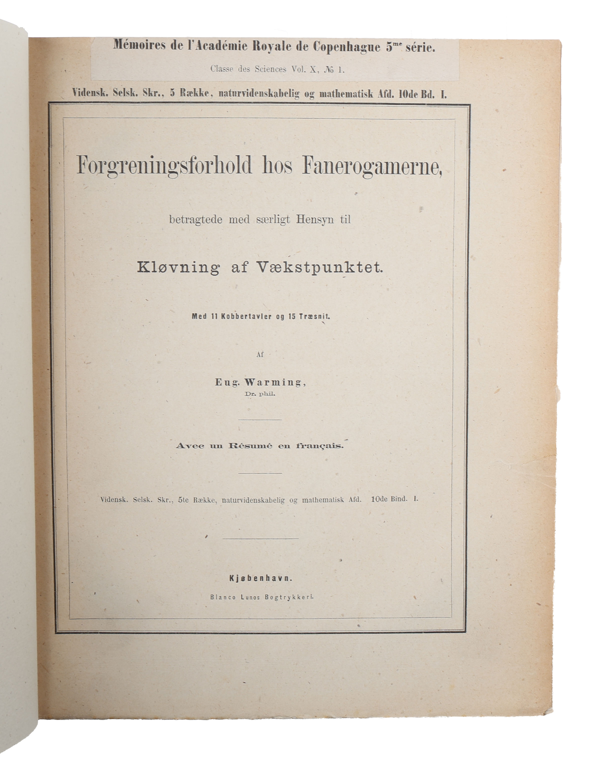 Forgreningsforhold hos Fanerogamerne, betragtede med særligt Hensyn til Kløvning af Vækstpunktet. (In: "Videnskabernes Selskabs Skrifter") - [WARMING'S DOCTORAL DISSERTATION]