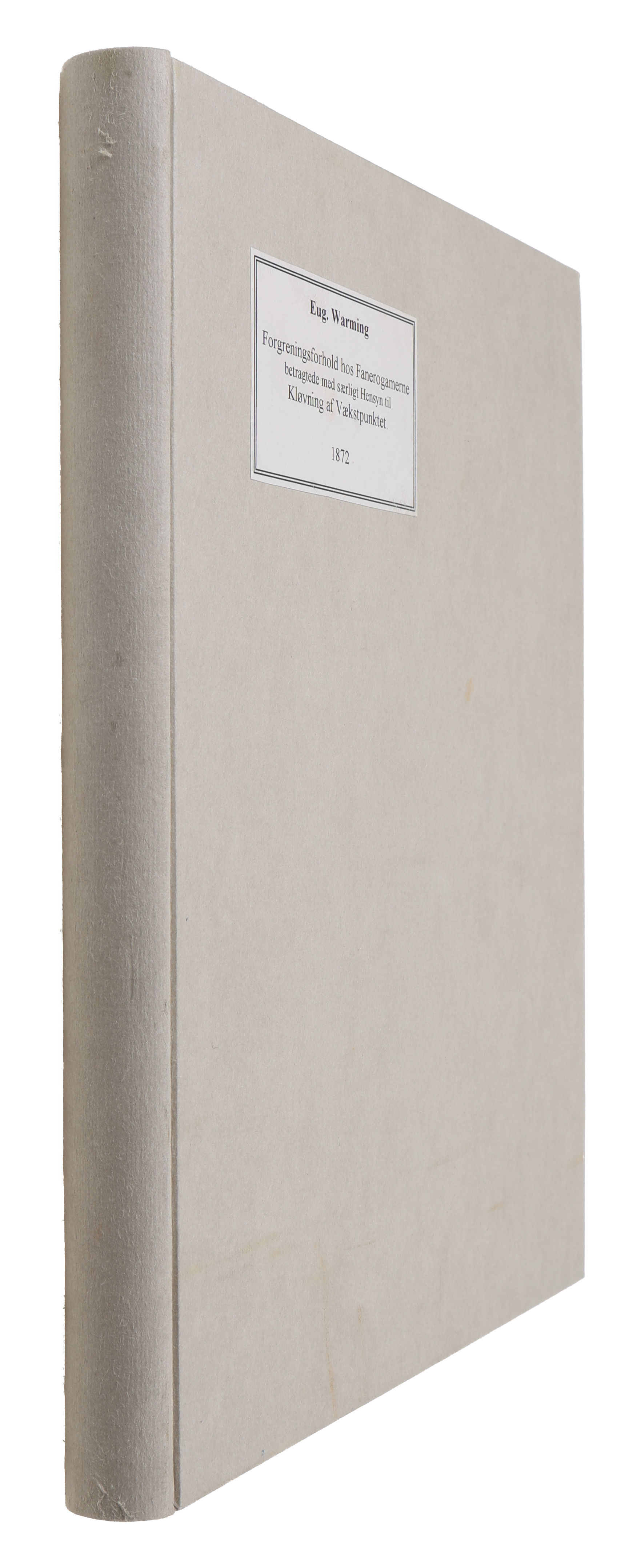 Rare first edition of Warming’s pricewinning work which stands as one of the earliest and most significant contributions to the study of plant morphology in Denmark. Submitted as his doctoral dissertation at the University of Copenhagen, this work laid the groundwork for Warming’s later, more famous contributions to ecology and plant geography. Yet, in its own right, “Forgreningsforhold” is a highly influential study that reflects the scientific rigor of a botanist ahead of his time.In this monograph, Warming investigates the structural and developmental principles underlying the branching patterns of phanerogams - seed-bearing plants that include both gymnosperms and angiosperms. Johannes Eugenius Warming (1841–1924), commonly known as Eugen Warming, was a pioneering Danish botanist widely recognized as one of the founding figures of modern ecology. He authored the first textbook on plant ecology in 1895, introduced the first university course in the subject, and helped define the scope and content of ecological science. In 1975, ecologist R. J. Goodland asserted: “If one individual can be singled out to be honoured as the founder of ecology, Warming should gain precedence” ("The Tropical Origin of Ecology: Eugen Warming's Jubilee"). Warming wrote a number of textbooks on botany, plant geography and ecology, which were translated to several languages and were immensely influential at their time and later. Most important were “Plantesamfund and Haandbog i den systematiske Botanik”.