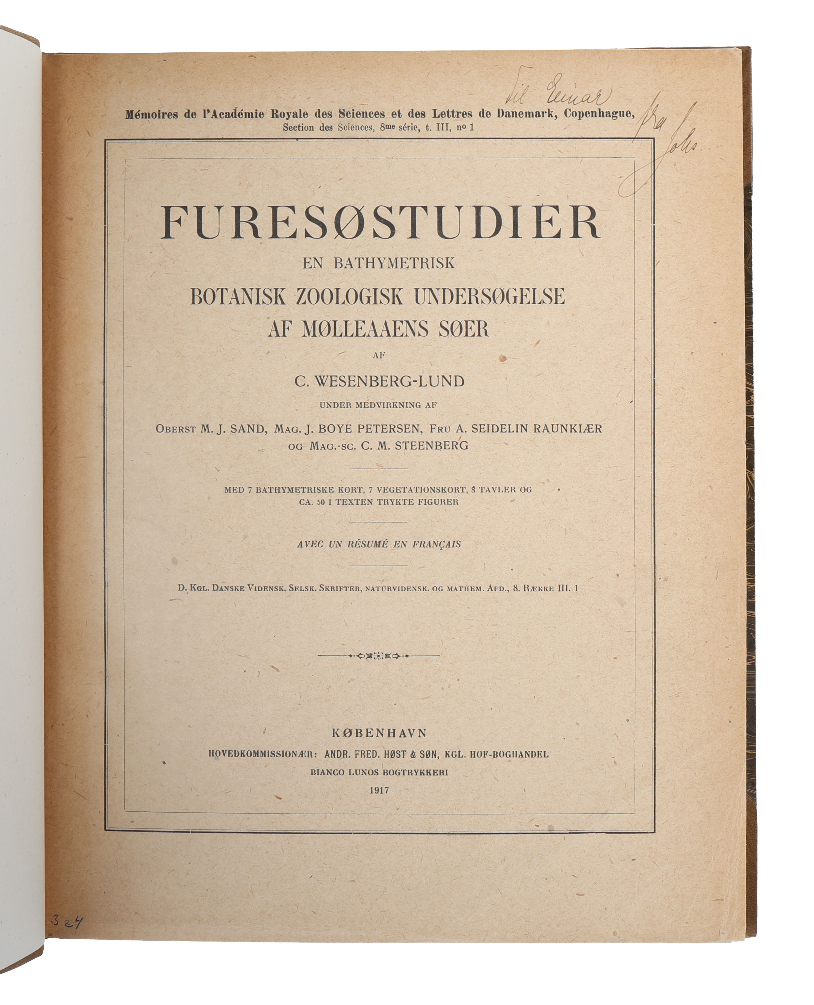 Furesøstudier en bathymetrisk botanisk zoologisk undersøgelse af Mølleaaens Søer. (In "D. Kgl. Danske Vidensk. Selsk. Skrifter). - [PRESENTATION-COPY]