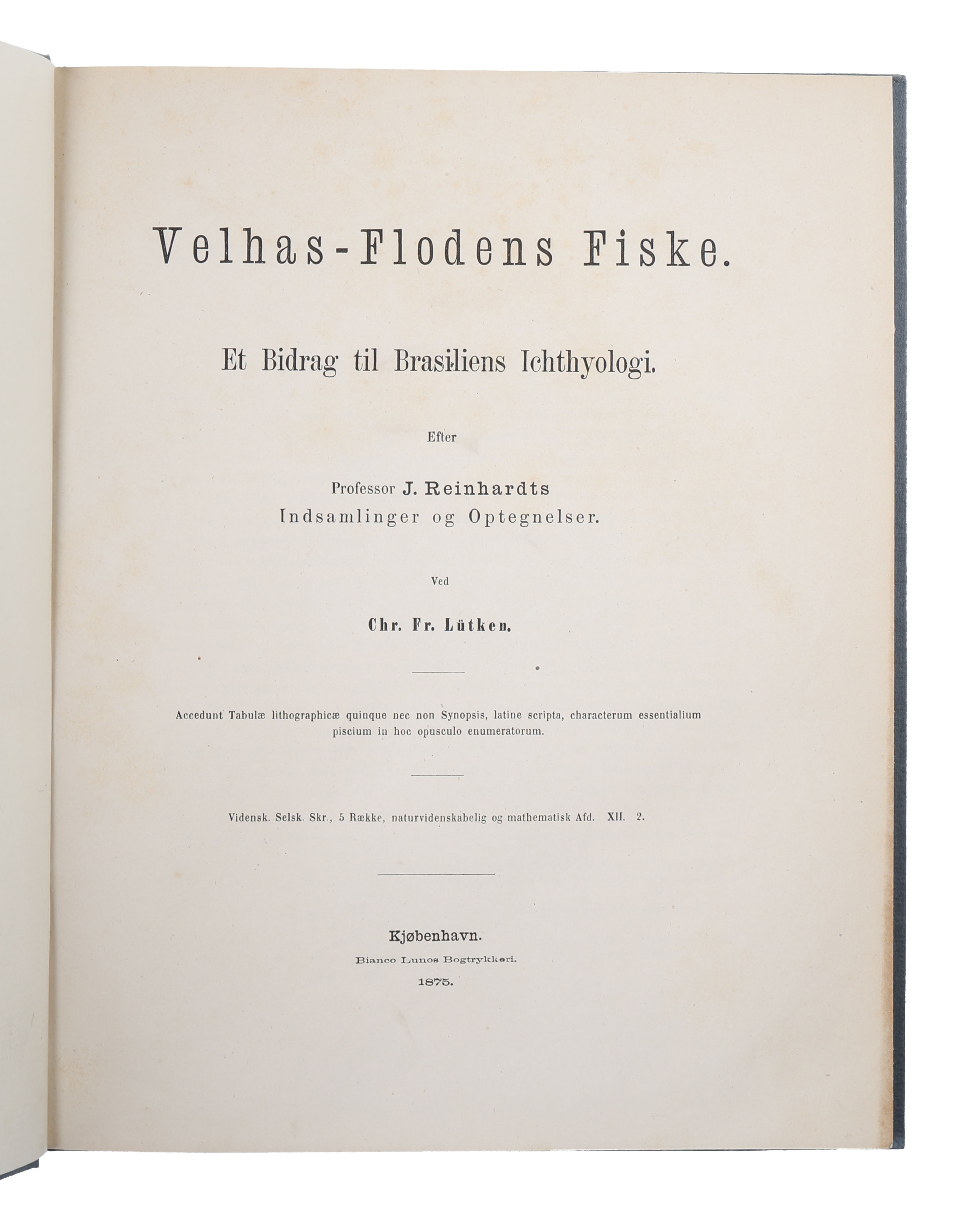 Velhas-Flodens Fiske. Et Bidrag til Brasiliens Ichtylogi. Efter J. Reinhardt Indsamlinger og Optegnelser. Ved Chr. Fr. Lütken. Accedunt Tabulae lithographicae nec non Synopsis, latine scripta, characterum essentialium piscium in hoc opusculo enumerato... - [ICHTYOLOGY OF BRAZIL]