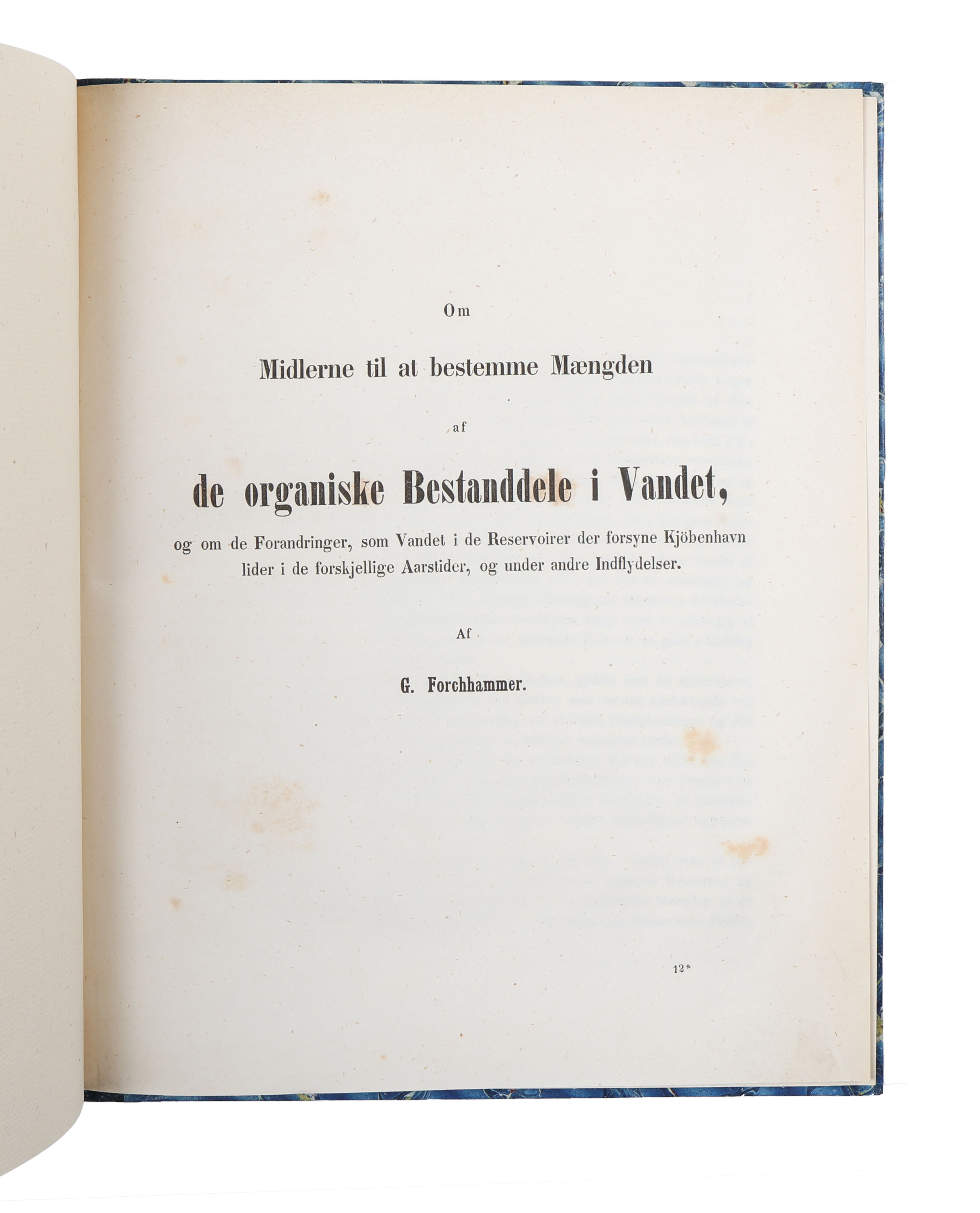 First edition of Forchhammer’s important work in which he outlines methods to measure organic content in water and examines changes in water supplies feeding Copenhagen’s reservoirs. He collaborated with engineers to assess raw water quality, which later influenced decisions on artesian well drilling to improve Copenhagen’s drinking-water supply. Forchhammer was a geologist, chemist and professor (1794–1865), noted for foundational work in marine chemistry and hydrography.