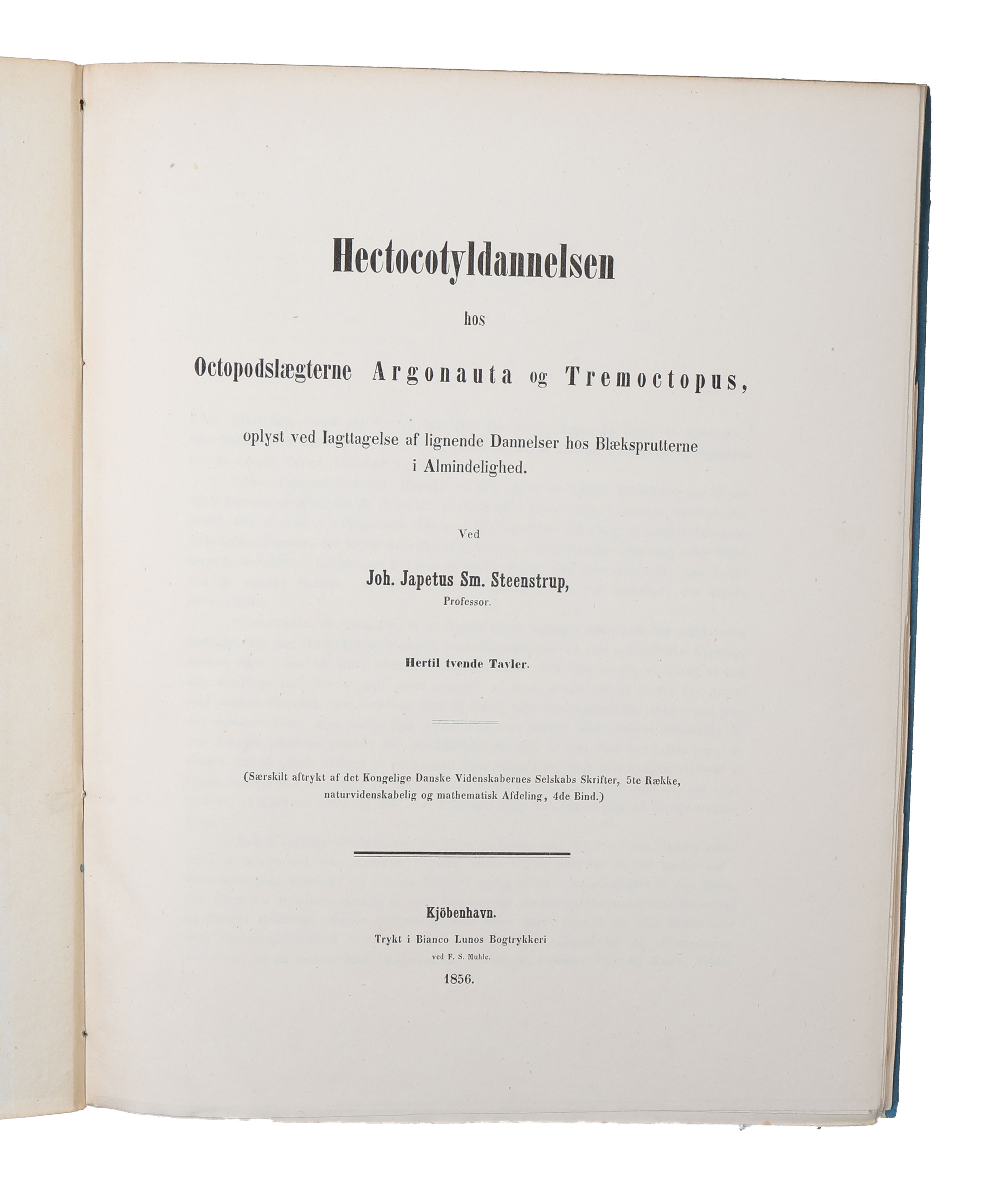 First printing of Steenstrups classic work on the octopods, where he for the first time disclosed the findings of a male arm filled with seminal fluid in the female. This object was, before Steenstrups finding, considered as a parasitic worm.