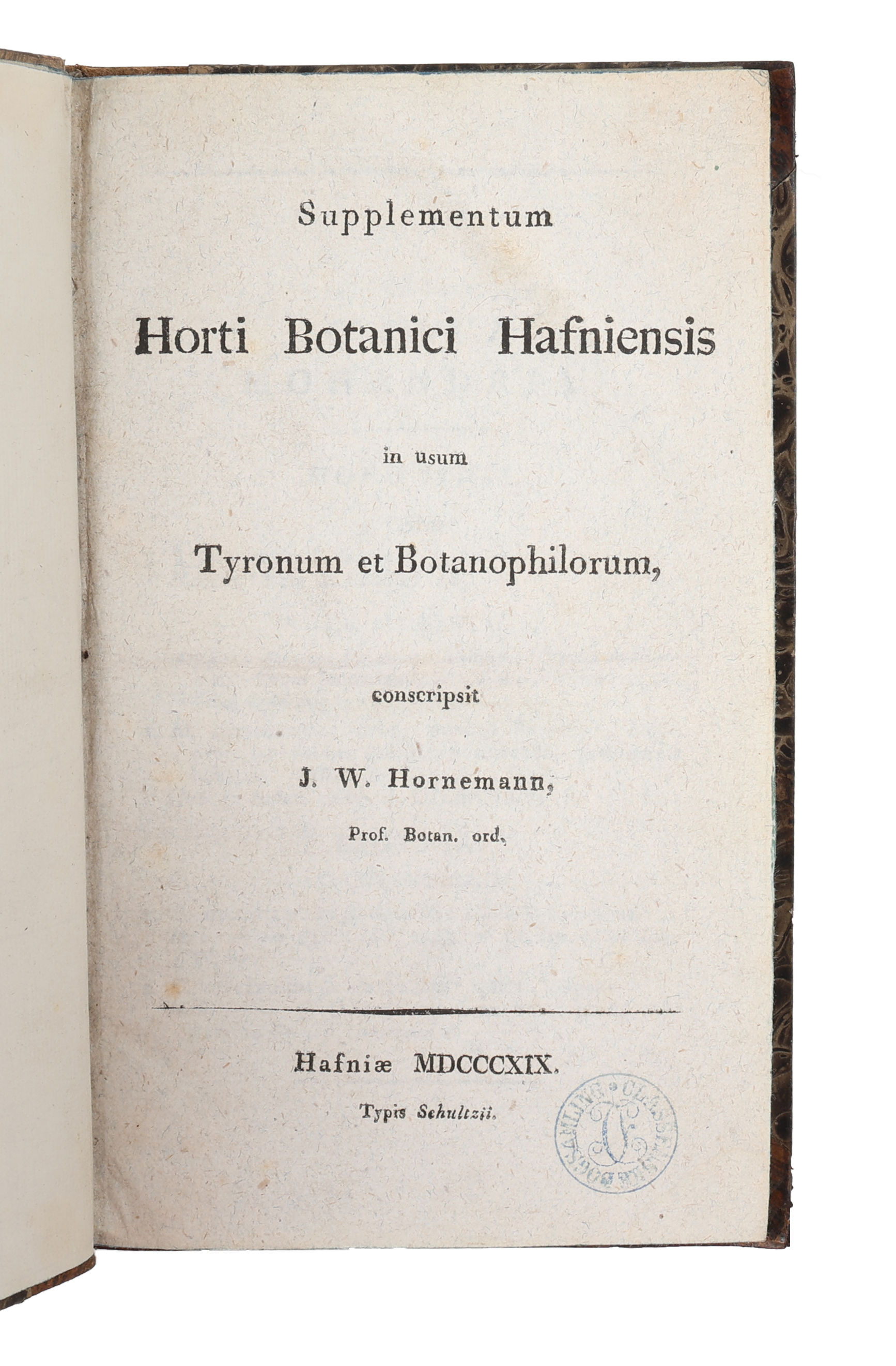 First edition of Hornemann’s catalogue of the Copenhagen Botanical Garden intended for students and amateur botanists. The work lists and classifies the Garden’s living plant collection according to the Linnaean system and served as a foundational teaching work in early 19th-century Danish botanical education. Jens Wilken Hornemann (1770–1841) later became one of Denmark’s most influential botanists. Trained under Martin Vahl at the University of Copenhagen and the Naturhistorieselskab he was appointed lecturer at the Botanical Garden in 1801, and succeeded Vahl as editor of Flora Danica in 1804.Biblioteca Danica II, 198.