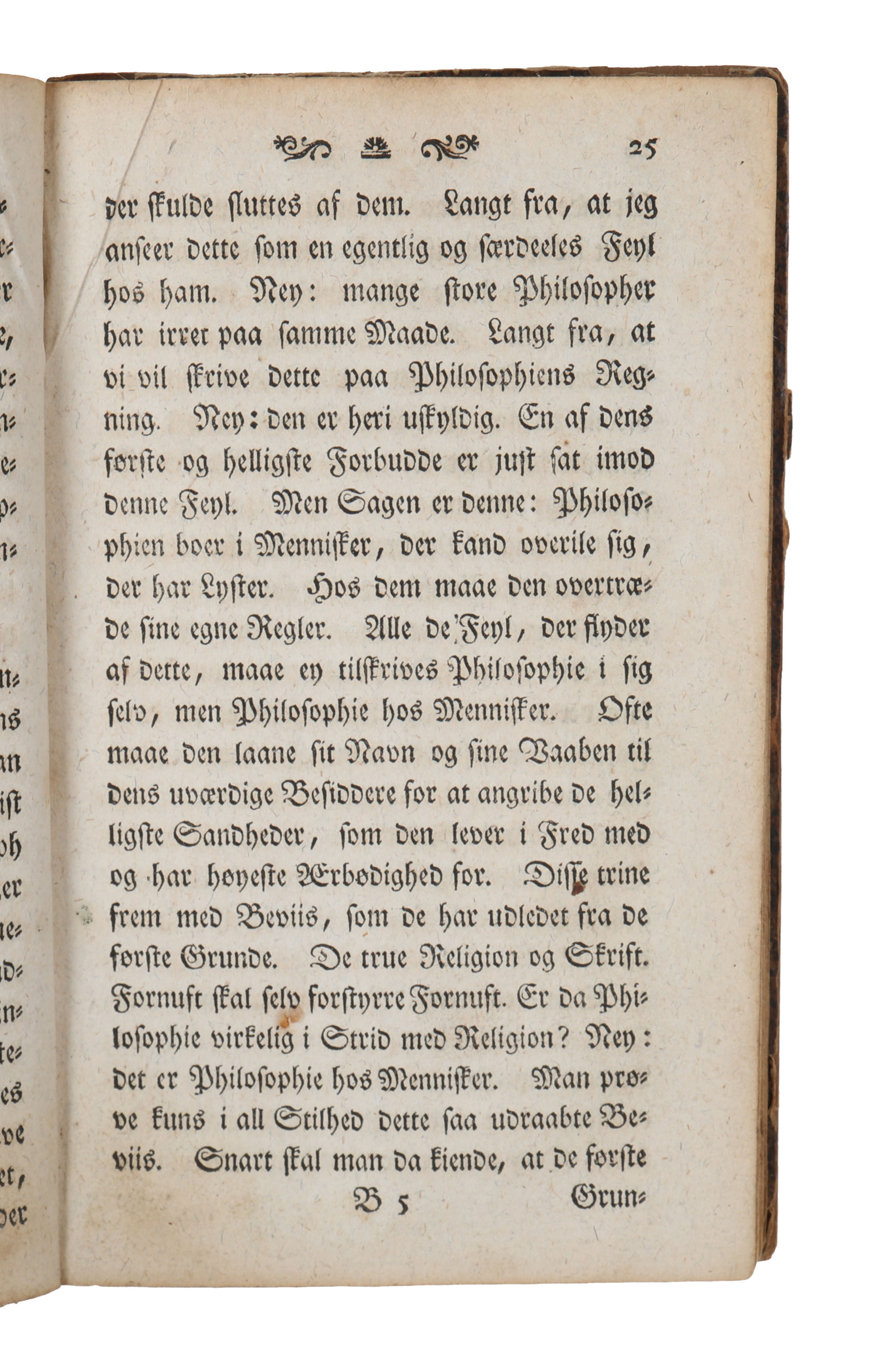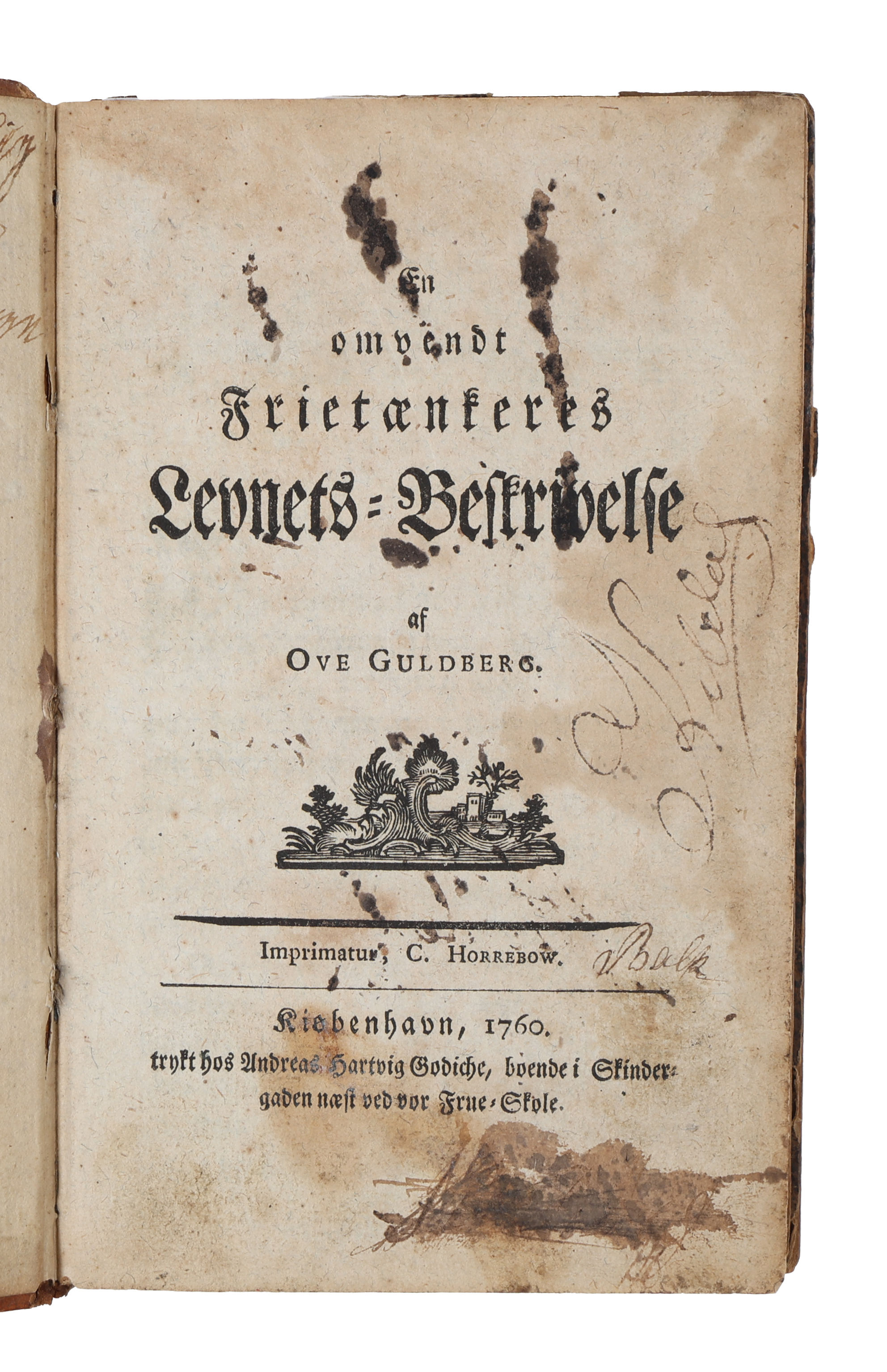 Kiøbenhavn, Godiche, 1760. 8vo. Samtidigt halvlæderbind over træpermer. Tre ophøjede bind på ryg. Øvre kapitæl bortslidt. Rifter i overtrækspapiret og slid ved kanter af permer. Adskillige tilskrifter og ejernavne på forsats og titelblad. Blad B3 (pp. 21-22) udrevet, men indlagt i nyere faksimile. Spredte brunpletter. 184 p.