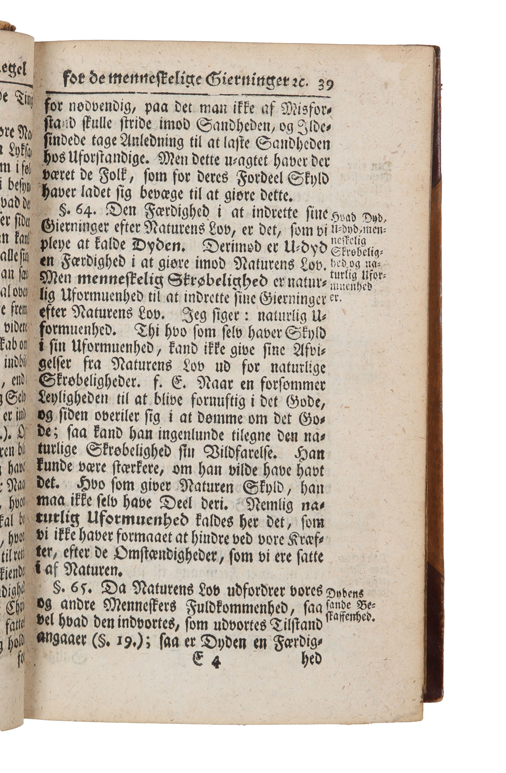 Rare first edition of the first Danish translation of Wolff's 'Vernünfftige Gedancken von der Menschen Thun und Lassen' (Halle, 1720).