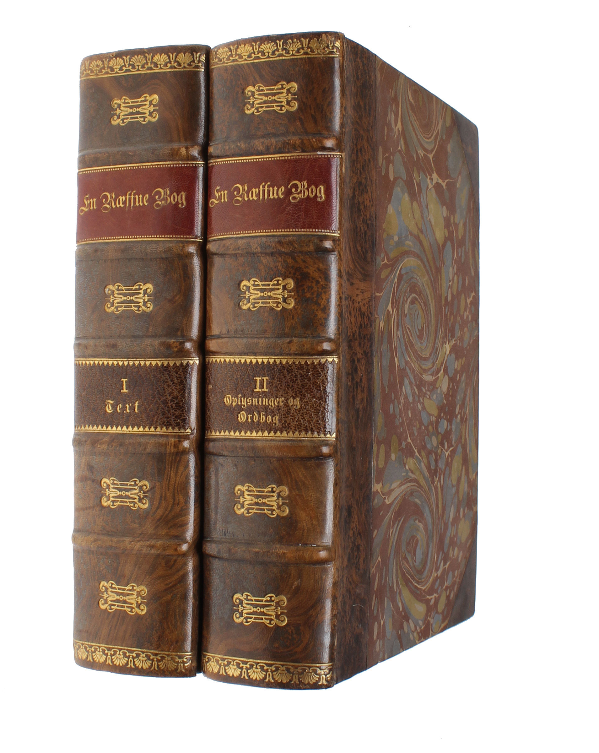 K., 1915. 4to. 2 meget smukke priv.hldrbd.i flammet kalv,oph.bdpå rygge og rig rygforgyldn.