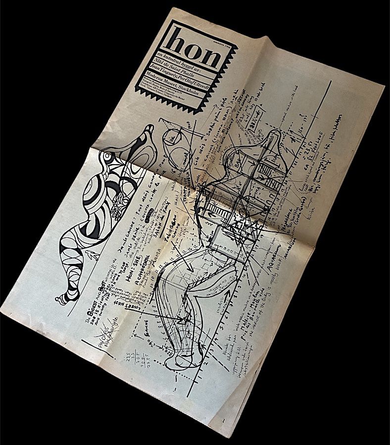 Moderna Museet, Stockholm. 1966. Typography: Hultén, Melin & Österlin. (Moderna Museets utställningskatalog No. 54). 8 pages, 52 black & white illustrations. 3 biographies. (58 x 38 cm), newspaper print with glued folds, additionally folded to approx. DIN A4. Front page illustration: working sketch. Rare and extremely fragile catalogue, here in best condition, but not, as often, perfectly folded. (Lutz Jahre 17 - 1966, John Melin till exempel page 25). Exhibition: Stockholm, Moderna Museet, June 4 - September 4, 1966 (80,000 visitors) As early as 1962, Niki de Saint Phalle, Jean Tinguely and Per Olof Ultvedt were involved in the Amsterdam exhibition project Dylaby (dynamic labyrinth), where nine spatial installations by various artists were shown to mark the departure of director Willem Sandberg. Pontus Hultén, who had been involved in the project as an advisor, wanted a collaborative work for his museum and invited several artists. This resulted in ”Hon”, a large walk-in sculpture (6.10 x 28.70 x 9.15 m) depicting a reclining woman with her legs spread. From the outside, it resembled the brightly painted Nanas by Niki de Saint Phalle. The interior of the sculpture was designed by Jean Tinguely and Per Olof Ultvedt. The entrance was in the vagina, a cinema was in one arm, a moving wooden brain was in the head, a planetarium in the right breast, a milk bar in the left, a Banc des amoureux with sound in the knee, a viewing platform on the stomach and a gallery of fake pictures in one leg. Things like a pay phone, a snack machine, a radio sculpture and even a postcard Piennale (works of the museum on postcards) were also represented. ”Hon” was realized at relatively short notice, which is why there was little time for publication and a newspaper brochure was published (colour illustration). Later, however, a detailed book (b/w illustration) was published in which the five-week work phase, the three-month exhibition and the three-day dismantling were documented with many pictures and press reactions. The project had been kept absolutely secret in the museum beforehand, and only the people involved were allowed to know about it, as Hultén feared that rumours could lead to the daring exhibition being closed before it even opened. An unexpectedly positive article in Time Magazine, which appeared early on, had a predominantly positive influence on the local press, although some of the expected outraged reactions did not fail to materialize, and there were many voices that called ”Hon” obscene or even the world's biggest whore.
