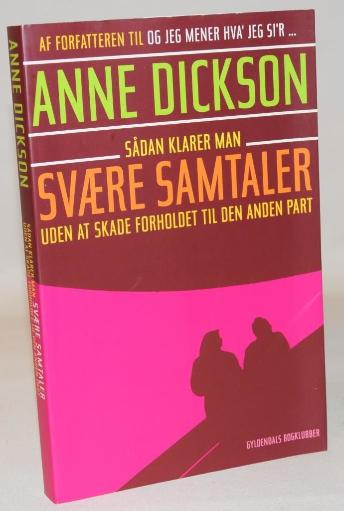 Gyldendals Bogklubber, 2005. 264 sider. Heftet med orig. omslag. Pænt eksemplar. En samtale kan føles svær og ubehagelig, allerede inden den har fundet sted, en tilspidset situation kan udvikle sig uhensigtsmæssigt, fordi man ikke har de fornødne redskaber. Vi kender det alle sammen. Anne Dickson ved, hvor det er, at man går fejl af hinanden, og via bogens eksempler får hun læseren til at nikke genkendende til de mange mekanismer, som fører parterne ud i en magtkamp i stedet for at nå til en fælles løsning. Og hun viser, hvordan konflikter kan løses, uanset om det er i privat- eller arbejdslivet. Dansk