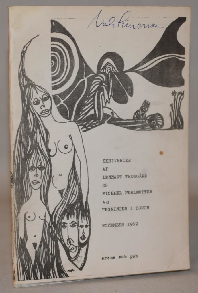 Arena sub-pub, 1969. 1969 sider. Hæftet. Pænt eksemplar. Illustreret i sort/hvid med 40 tegninger i touch. Dette eksemplar har tilhørt digteren Niels Simonsen og har hans navnetræk på omslaget. Dansk