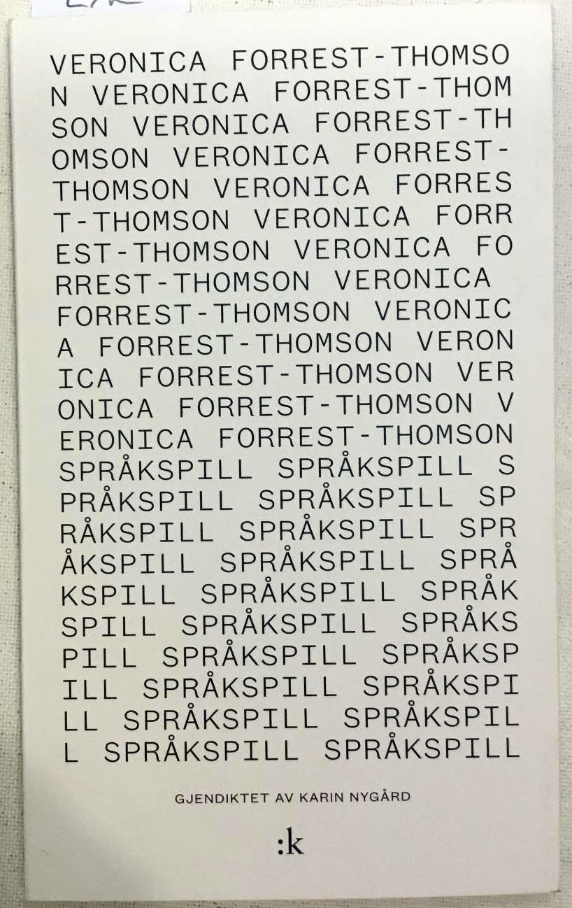 Originaltittel: Language games. Veronica Forrest-Thomson (1947-1975). Malaysisk/skotsk poet og kritisk teoretikar. I denne boka nærmar ho seg filosofiske spørsmål i posiens formspråk. Abstrakte teoriar vert sett opp mot kvardagslege røynsler ""medan logikken avsporas av lyriske struturar"". Skarpkantaa kollasjar fører saman T. S. Eliot og Lille trille, Ludvig Wittgenstein og Marcel Proust
