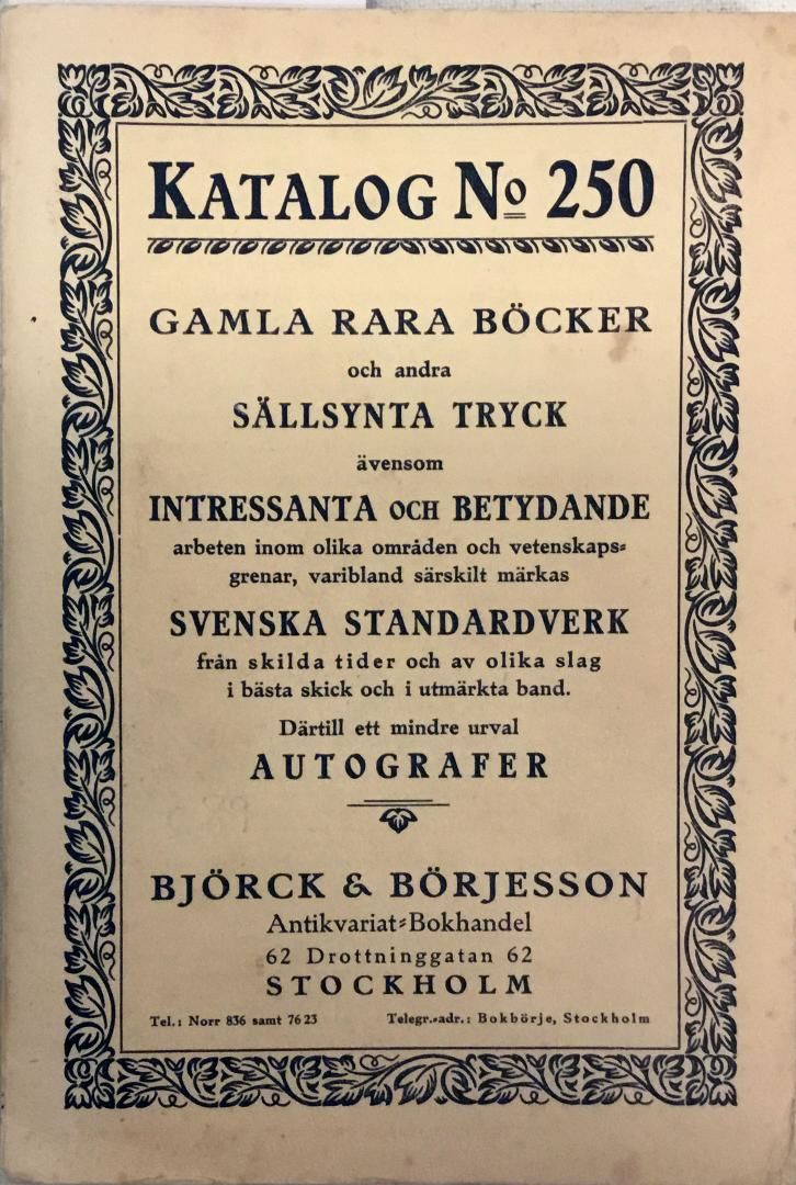 Stockholm 1930. Björck & Börjesson. 8vo. 289 s. 2.929 oppføringar. Illustrert med plansjar, foto og faksimilar. Hefta. Originalt lyst omslag, svart ryggtittel. Nokre bruksspor, men katalogen er i bra stand