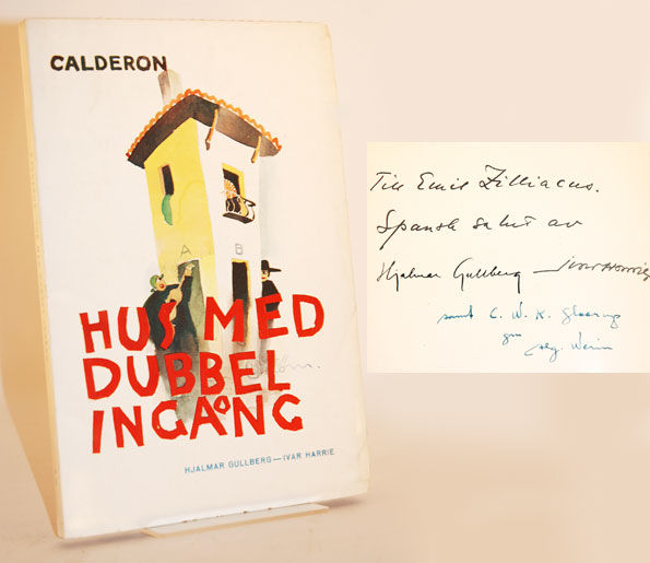 Lund; Gleerups, 1934. Originalets titel: Casa con dos Puertas mala es de guardar. 8:o. 126 s. Häftad med illustrerat omslag. Ouppskuren. Nedre omslagshörnen lätt veckade. Fint ex. Dedikation från båda översättarna samt förläggaren: ""Till Emil Zilliacus. Spansk salut av Hjalmar Gullberg – Ivar Harrie / samt C. W. K. Gleerup gm Alg. Werin"".