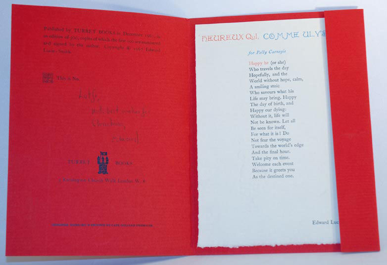 London; Turret Books, 1967. 1st ed. A broadside [approximately 20x14,5 cm] printed in 3 colours on handmade paper and affixed to red card wrappers. Designed, hand-set and printed in 500 copies at the Cape Goliard Press. The first 100 copies were numbered and signed, this is one of the 400 unnumbered. Inscribed to the poet and photographer Lütfi Özkök: ""Lutfi, with best wishes for Christmas, Edward"".