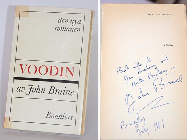 Stockholm; Bonniers, 1961. (Den nya romanen). Originalets titel: The Vodi (1959). 21x13,5 cm. 225, (1) s. Häftad med tryckt omslag. Nedre omslagskanterna lätt veckade. Tejplagning vid rygghvuud resp. ryggfot. Dedikation: ""Best wishes to Jan Broberg and Britta Broberg -- John Braine / Bingley July 1961"". Jan Broberg (1932-2012), litteraturkritiker och en av Sveriges främsta deckarexperter fick boken av författaren vid ett intervjutillfälle.