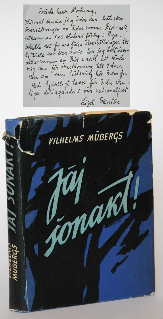 Riga; Valsts Izdevnieciba, 1962. Original title: Rid i natt! (Stockholm, 1941). Translation by Elija Kliene. 17x14 cm. 331, (4, 1 blank) pp. Publisher's blue quarter cloth with printed dustjacket. The jacket is chipped and torn, rear inner flap is loose, and there is a long tear on rear panel which has partly been mended with tape..Spine ends are a bit bumped. There is a short tear in lower margin on pp. 313-322. Pp. 323-331 are creased at lower, inner corners, and the contents page is creased and has a long tear in lower margin. First Latvian edition of Rid i natt! Laid-in is a letter to Vilhelm Moberg from the translator from Swedish and German Lizete Skalbe, who thanks him for his participating in the Latvian national feast day.