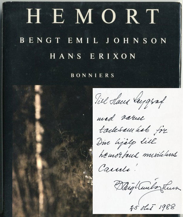 Stockholm; Bonniers, 1984. Originalupplaga. 20x15,5 cm. Opaginerad. (83, 5 blanka) s. Förlagets pappband med tryckt skyddsomslag. Omslaget lätt nött vid rygghuvudet och pärmhörnen. Fint ex. Dedikation till pianisten och tonsättaren Hans Leygraf (1920-2011): ""Hans Leygraf med varm tacksamhet för Din hjälp till hemortens musikhus / Bengt Emil Johnson / 25 okt 1988"".