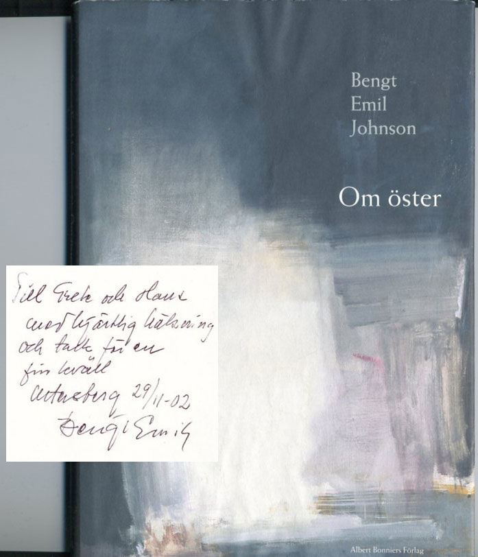 Stockholm; Bonniers, 1999. Originalupplaga. 22x15,5 cm. 75, (1, 2 blanka) s. Förlagets pappband med tryckt skyddsomslag. Omslagets främre panel något vågig. Fint ex. Dedikation till pianisten och tonsättaren Han Leygraf med fru: ""Till Grete och Hans med hjärtlig hälsning och tack för en fin kväll / [ortsnamn] 29/11 -02 / Bengt Emil"".