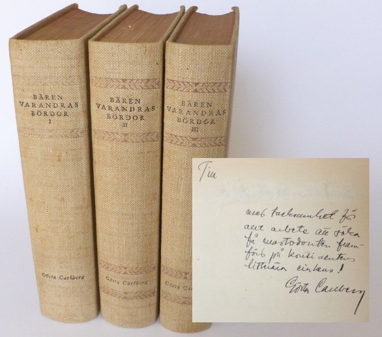 Stockholm; Bonniers, 1937. Originalupplaga. 24x17,5 cm. 526, (1, 1 blank) & 507, (1, 2 blanka) & 448, (2) s. Tre volymer i förlagets tryckta grå linneband med röda övre snitt, utan skyddsomslag. Med häftesomslagen medbundna. Banden med några små fläckar. Första volymen med sn svag fuktring på främre snittet. Andra volymen med en liten fläck på främre snittet samt en kort reva i övre marginalen på s. 167/168. En litewn fläck i yttermarginalen på sista bladet i tredje volymen. Bra uppsättning. ""Bären varandras bördor, som vann första pris i Bonniers jubileumspristävlan, är en hänsynslöst självrannsakande pubertetsskildring, som förvandlas till en psykologisk kartläggning av olika människotyper. C. visar sig vara väl förtrogen med psykoanalys och romanens motiv, kärlekslöshetens och oförståelsens förödande inverkan på barn, fullföljes med obönhörlig rätlinjighet."" (Svenskt Litteraturlexikon). Författarens debut. Dedikation i första volymen med mottagarens namn bortskrapat: ""Till [...] med tacksamhet för allt arbete att söka få mastodonten framförd på kontinentens litterära cirkus! / Gösta Carlberg"".