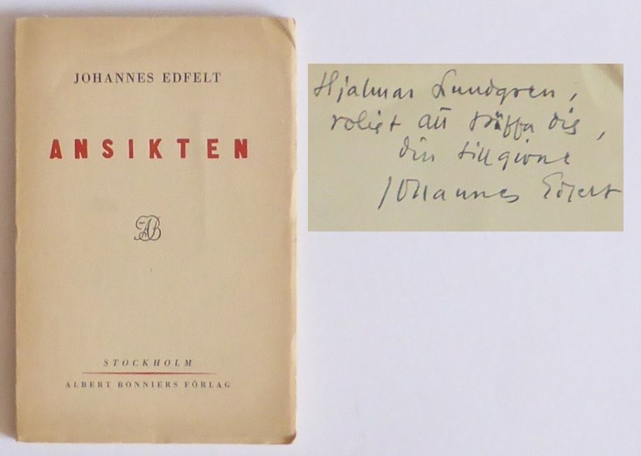 Stockholm; Bonniers, 1929. Originalupplaga. 19,5x13 cm. 116 s. Häftad med tryckt omslag. Nästan genomgående hörnveck upptill samt ett svagt genomgående veck i övre marginalen. Dedikation: ""Hjalmar Lundgren, roligt att träffa dig, din tillgivne Johannes Edfelt"".