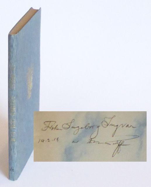 Lund; Gleerup, 1915. 18,5x12 cm. (3, 1 blank), 107, (1) s. Blått originalklotband med förgylld lyra på främre pärm och marmorerade försättsblad. Häftesomslaget medbundet. Romanisten Fredrik Wulff (1845-1930) gav ut denna diktsamling till sin 70-årsdag. Vissa dikter har varit publicerade i tidningar medan andra publicerades här för första gången. Innehåller bl. a. Den drunknade gossen / Till Giacomo Leopardis minne. Sonett. 1898 / Till min kära döda. Sonett. 1902 / Till Verner vo Heidenstam på Naddö. Tre sonetter. 1909 / Hälsning till Salomon Smith. 1910 / Vid budet om Stellan Mörners död. 1912. Med en dedikation på främre försättsblad: ""Fröken Ingeborg Ingvar av Fr. Wulff / 14.2.18"".