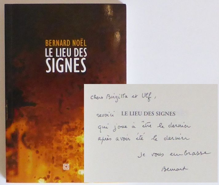 Paris; Éditions Lignes & Manifestes, 2006. 20,5x14 cm. 177, (2, 3 blanka) s. Häftad med tryckt omslag. Mindre hörnveck upptill på omslaget. Fint ex. Nyutgåva av boken som ursprungligen utgavs 1971. Dedikation: ""Chers Birgitta et Ulf, revoici [Le Lieu des signes] qui joue à être le dernier / après avoir été le dernier / Je vous embrasse / Bernard"". Mottagare var Ulf och Birgitta Trotzig. Den franske poeten Noël skrev ett förord i katalogen till Ulf Trotzigs utställning i Paris 1985 och Birgitta skrev förord till Noëls på svenska utkomna böcker ""Motdöd"" (2004) och ""Nattvardsslottet"" (2004). Original printed wrappers. Top corners on the wrappers are slightly creased. A fine copy. Inscribed by the author to Swedish artist Ulf Trotzig and Swedish author and member of the Swedish Academy Birgitta Trotzig. Noël wrote the preface to the catalogue of Ulf's exhibition in Paris in 1985, and Birgitta wrote prefaces for two of Noël's books published in Swedish translation.