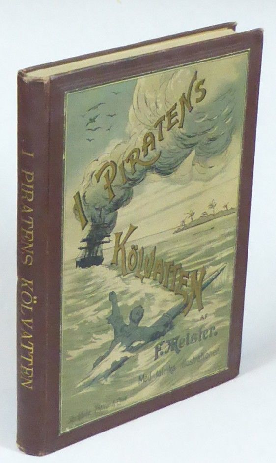 Stockholm; Fröléen & c:o, 1893. Originalets titel: Im Kielwasser des Piraten (Leipzig, 1898). 23x16 cm. 236 s. + 8 planscher. Förlagets bruna klotband med monterad titelplansch på främre pärm. Med Wettergren & Kerber bokhandels etikett på främre innerpärm. Exlibris för Gunnar Larsson samt med dennes namnteckning, daterad 1915. Lätt snedläst. Ryggändar och pärmhörn något tilltryckta. En nagg i yttermarginalen på s. 73/74, annars en fin inlaga.