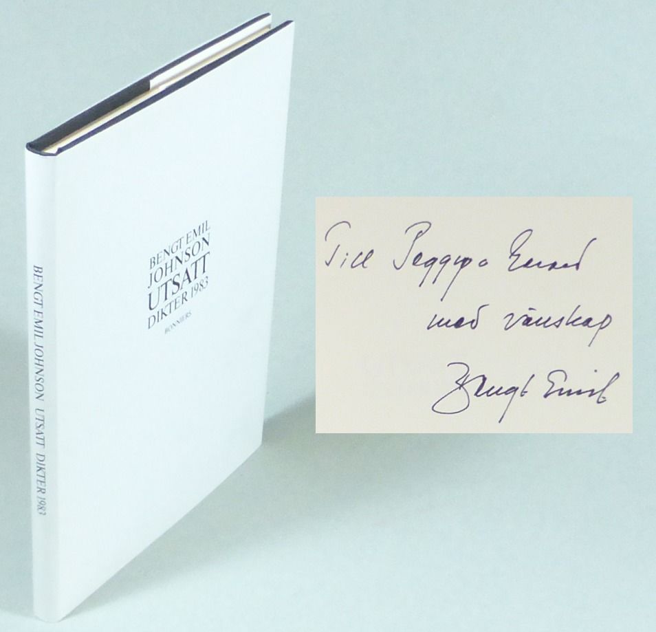 Stockholm; Bonniers, 1985. Originalupplaga. 22x16 cm. 105, (1, 4 blanka) s. Förlagets pappband med tryckt skyddsomslag. Omslaget obetydligt solkat. Fint ex. Med en dedikation till Johnsons förläggare Gerard och Peggy Bonnier: ""Till Peggy o Gerard / med vänskap / Bengt Emil"".