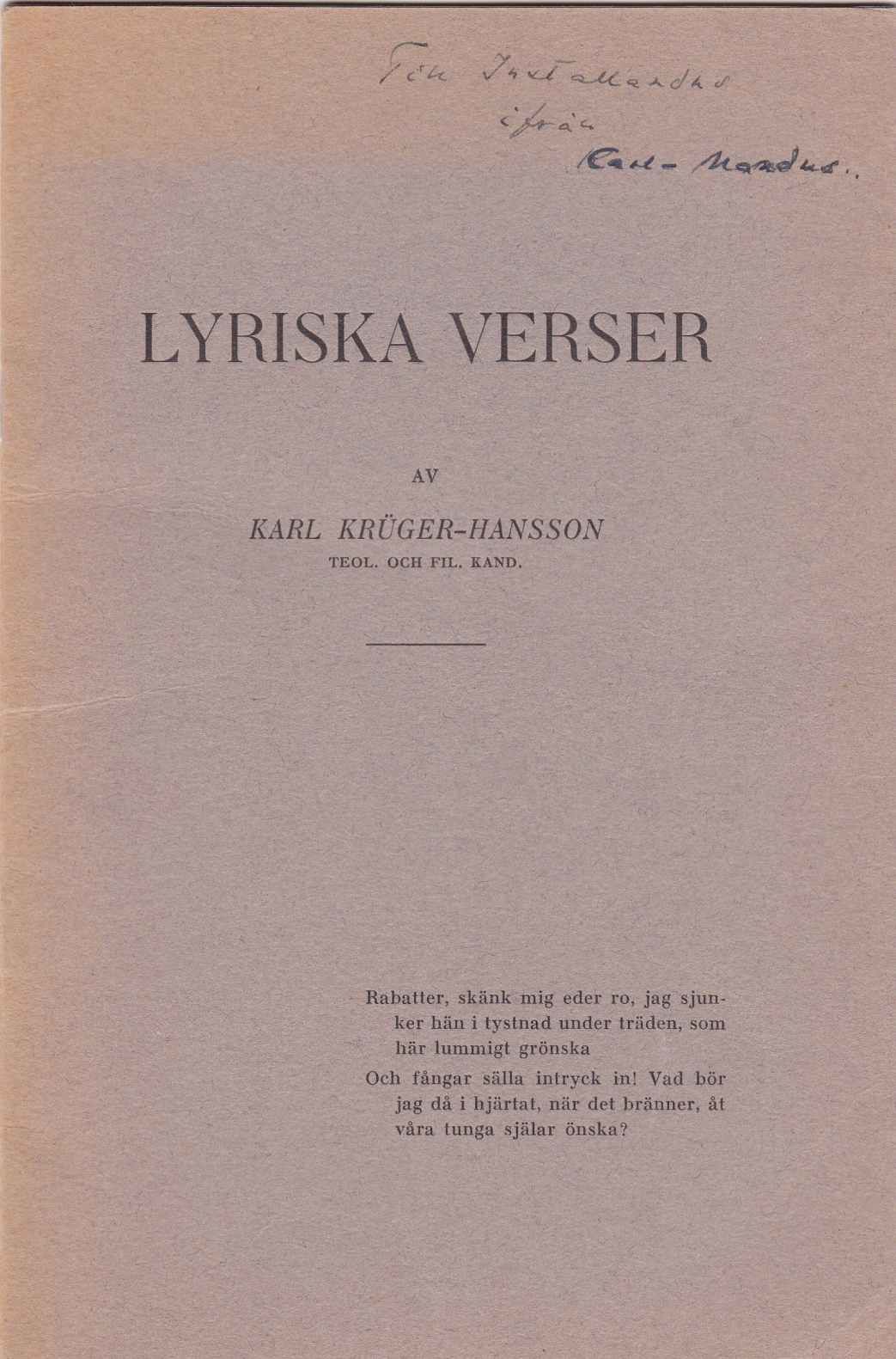 Lund; Carl Bloms boktryckeri AB, 1955. Originalupplaga. 20,5x13,5 cm. 16 s. Klammerhäftad med tryckt omslag. Omslaget med något bleknade marginaler. Gåvotillskrift på främre omslag. Fint ex. Återanvändning av titeln ""Lyriska verser"", vilken författaren använde för ett till formatet identiskt verk 1948, innehållet skiljer sig dock.