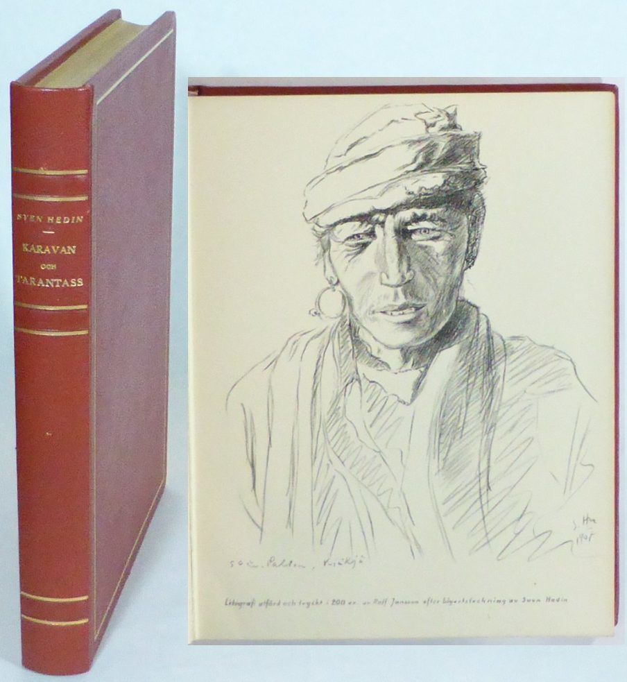 Stockholm; Bonniers, 1953. 25,5x20 cm. 286, (1, 1 blank) s. + originallitografi. Förlagets röda skinnband med förgylld ryggtitel och helt guldsnitt. Bandet obetydligt nött. Mycket fint ex. Litografin är utförd av Gösta Montell efter en blyertsteckning av Hedin och tryckt i 200 exemplar, signerade av konstnären. Detta är exemplar nr 73 och är bundet för Carl-Gustaf Wrangel.
