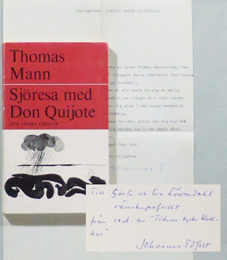 Stockholm; Tidens Förlag, 1964. (Tidens tyska klassiker). 18,5x11,5 cm. 134, (1, 1 blank) s. Häftad med tryckt omslag. Omslag av Nils Skoog. Obetydligt nött rygg. Fint ex. Innehåller även ""Tanke och liv"" och ""Fantasi över Goethe"", samt en inledning av Bengt Holmqvist. Översättning av Margaretha Holmqvist. Originalens titlar: ""Meerfahrt mit Don Quijote"" (i ""Leiden und Grösse der Meister. Neue Aufsätze"". Berlin, 1935), ""Denken und Leben"" (i ""Altes und Neues"". Frankfurt am Main, 1953) och ""Phantasie über Goethe"" (i ""Neue Studien"". Stockholm, 1948). ""Sjöresa med Don Quijote"" publicerades först i BLM, första svenska utgåvan för övriga essäer. Med en dedikation från Johannes Edfelt, redaktören för Tidens tyska klassikerserie, till litteraturhistorikern Gösta Löwendahl med fru: ""Till Gösta och Eva Löwendahl / vänskapsfullt från red. av 'Tidens tyska klassiker' / Johannes Edfelt"". Även med ett maskinskrivet och signerat brev från Edfelt till samma mottagare, daterat 1964, där han bl. a. tackar Gösta för en essä över sin egen lyriska produktion.