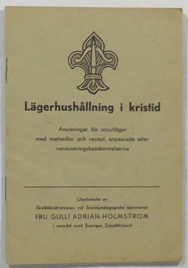 Lägerhushållning i kristid. Anvisningar för scoutläger med matsedlar och recept, anpassade efter ransoneringsbestämmelserna. Utarbetad av skolkökslärarinnan vid Socialpedagogiska seminariet fru Gulli Adrian-Holmström, i samråd med Sveriges Scoutförbund.