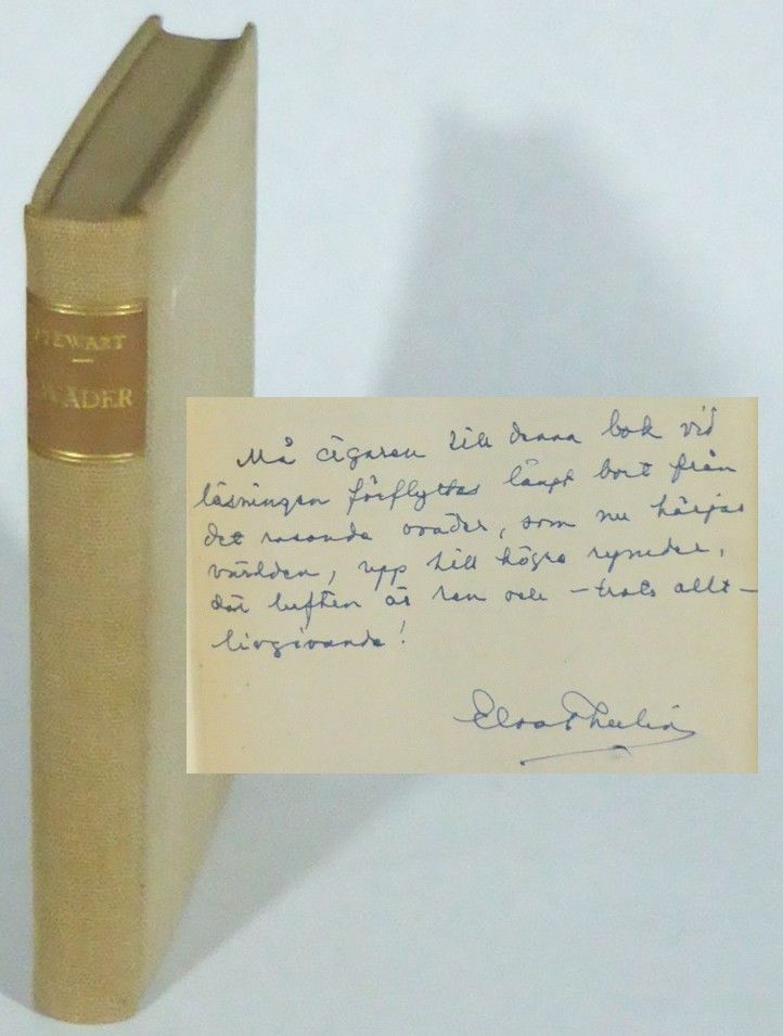 Stockholm; Ljus Förlag, 1942. Originalets titel: Storm (New York, 1941). 21,5x16 cm. 316 s. + utvikbar karta. Ljusbrunt klotband med ryggetikett i mörkare brunt skinn. Främre omslaget medbundet. Omslagsteckning av Olle Hjortzberg. Med astronomiprofessorn Gunnar Larsson-Leanders namnteckning på främre försättsblad. Ryggen aningen mörknad. En vit fläck på främre pärm i form av vitt tyg från inbindningen. Fint ex. Första svenska utgåvan av bestsellern om en cyklon i Stilla havet som hotar Kalifornien. Med stämpeln ""Med hälsning från Ljus Förlag"" nederst på titelbladet och en dedikation från översättaren på halvtitelbladet: ""Må ägaren till denna bok vid läsningen förflyttas långt bort från det rasande oväder, som nu härjar världen, upp till högre rymder, där luften är len och trots allt - livgivande! / Elsa Thulin"". Boken har troligen utgjort ett pris i en av förlagets tävlingar. Tan cloth with darker brown leather-label on spine. Front wrapper is bound-in. With an illustration on front wrapper by Olle Hjortzberg. Signature of Gunnar Larsson-Leander, professor of astronomy, on front free endpaper. Spine is slightly toned. There is a small mark of white cloth on front board. A fine copy of the first Swedish edition of ""Storm"". With the publisher's stamp on the title, and an inscription by the translator on the half-title, to ""the owner of this book..."", which has probably served as a prize.