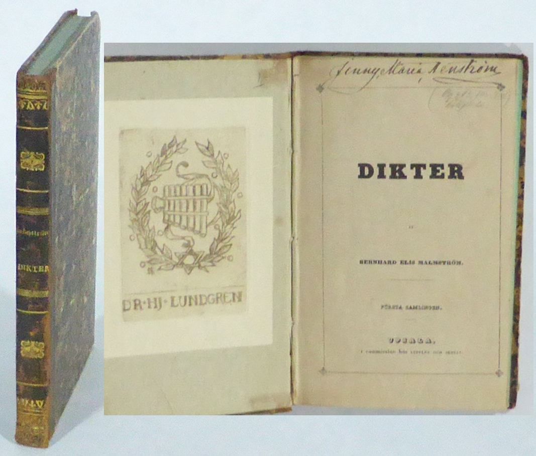 Uppsala; i commission hos Leffler och Sebell, 1845. Originalupplaga. 8:o. 17,5x11 cm. (4), 192 s. Samtida brunt halvfranskt band med förgylld ryggdekor, marmorerade pärmpapper och gröna snitt. Tidig ägares namnteckning överst på titelbladet (Jenny Maria Henström) samt med Hjalmar Lundgrens exlibris. Ryggen något nött samt med spricka i båda nedre falsar. Nötta pärmhörn. Inlagan med ett fåtal spridda småfläckar. Malmströms första egentliga diktsamlimg, som innehåller nyskrivet material samt dikter som tidigare varit publicerade, framförallt i tidskriften Eos. Dikterna är samlade under rubrikerna ""Elegier"", ""Romanser och visor"", ""Erotiska dikter"" och ""Blandade dikter"". 1847 utgavs ""Dikter. Andra samlingen"".