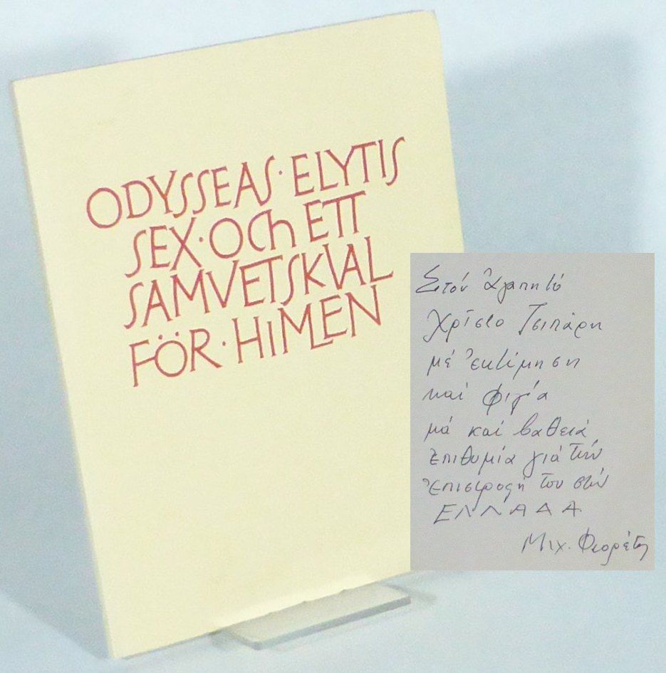 Stockholm; FIB:s Lyrikklubb/Tidens förlag, 1979. Originalets titel: Exi kai mia typsis gia ton ourano (1961). 19,5x15,5 cm. 41, (1, 2 blanka) s. Häftad med tryckt omslag. Med teckningar av Aleksandros Fassianos. Det överdimensionerade omslaget är aningen veckat i nedre marginalerna. Fint ex. Med ett förord av Söderberg. Första diktsamlingen av Elytis i svensk översättning. Dedikation på grekiska från Fioretos till lektorn i gammalgrekiska Christos Tsiparis (1937-2021).